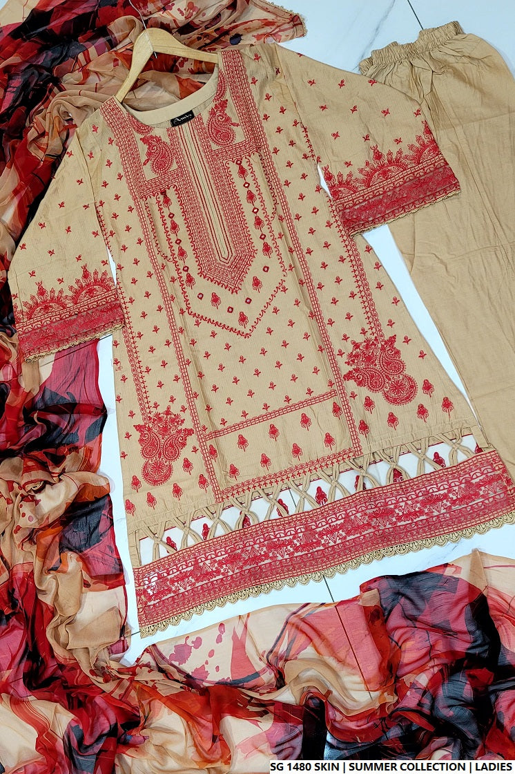This chic 3-piece outfit features a stylish A-line shirt crafted from soft, breathable cotton, offering both comfort and elegance. The shirt and trouser, made from high-quality cotton, are perfect for daily wear, while the digital chiffon dupatta adds a contemporary and vibrant touch. With a shirt length of 41 to 43 inches, this ensemble is ideal for casual gatherings, day-to-day wear, or semi-formal occasions. Weighing just 0.550 KG, this lightweight outfit ensures both ease of movement and effortless style.