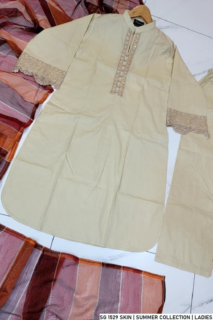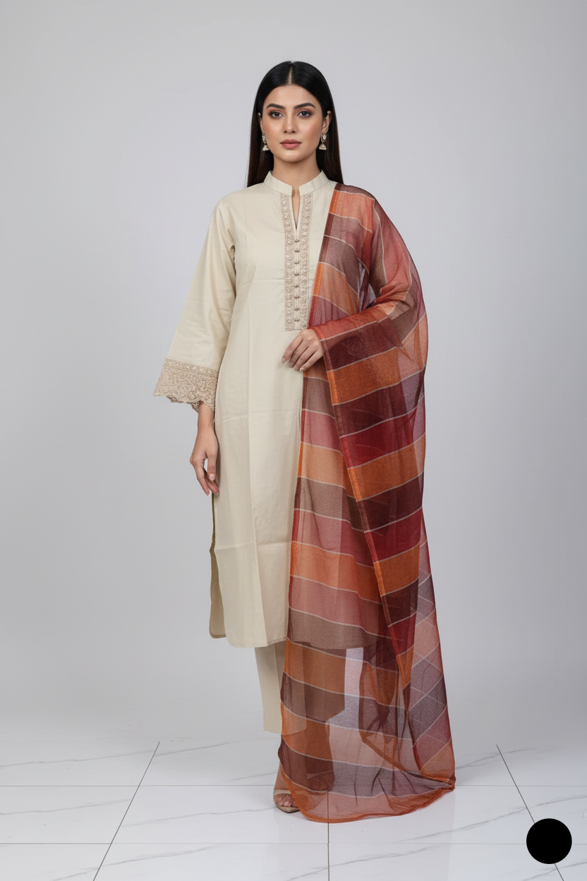 This stylish three-piece suit features a cotton Goal Daman shirt designed in a flattering silhouette with a shirt length ranging from 41 to 43 inches. The set includes matching cotton trousers for everyday comfort and a digitally printed dupatta that adds a modern, vibrant touch to the overall look. With a total weight of just 0.450 kg, this lightweight outfit is ideal for daily wear or casual outings, offering both elegance and ease.