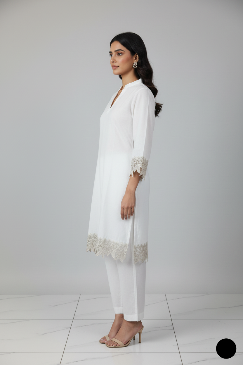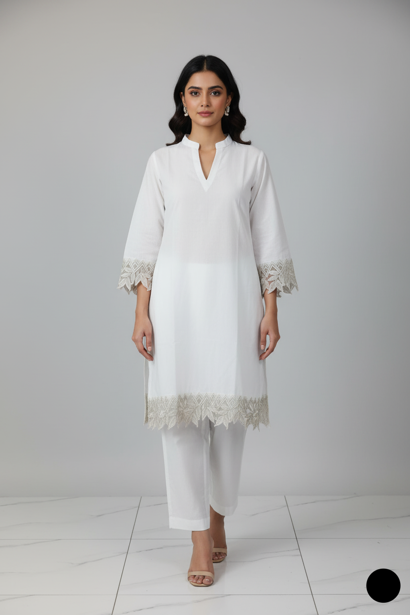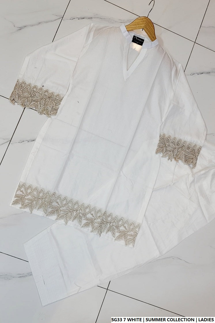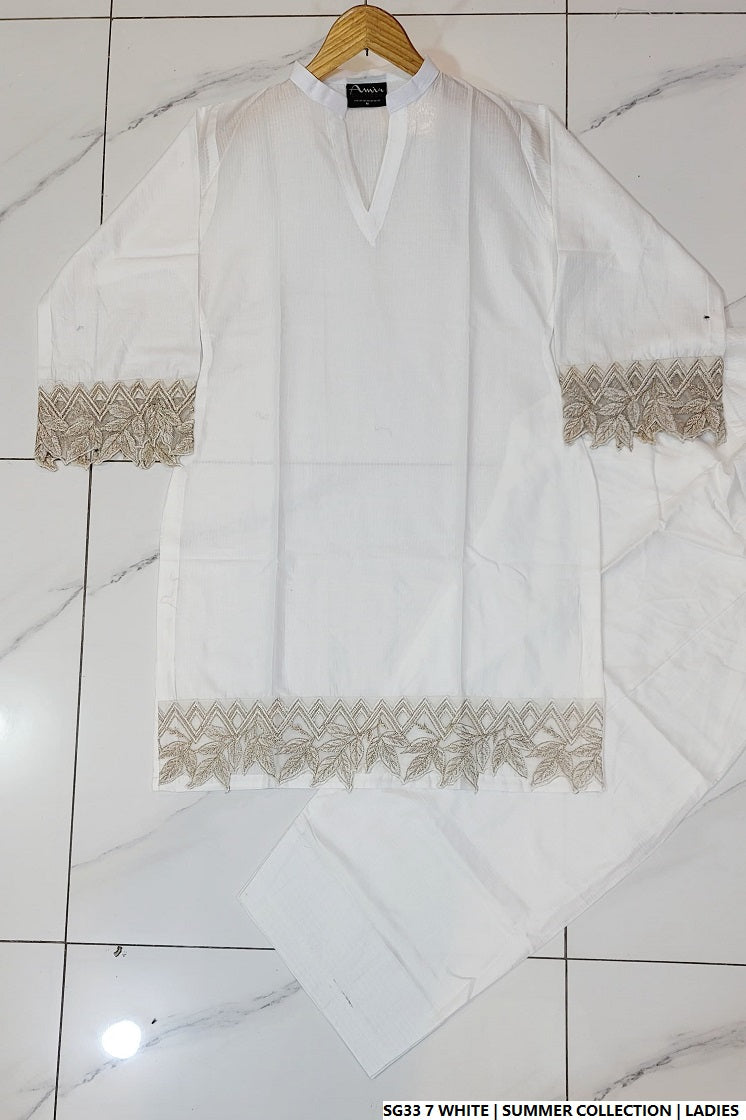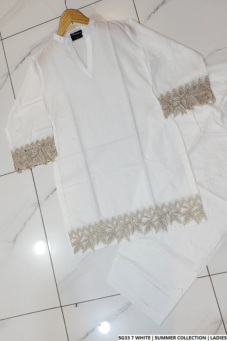 This beautiful outfit is crafted from soft cotton fabric, making it a perfect choice for all-day comfort. The straight shirt, paired with a classic farshi shalwar, offers a traditional yet elegant silhouette. It features a shirt length of 38 to 40 inches, allowing for modest coverage and a flattering fit. The two-piece completes the look, making it suitable for both casual and semi-formal occasions. Weighing just 0.450 kg, this ensemble is light, breathable, and easy to wear in warmer weather.