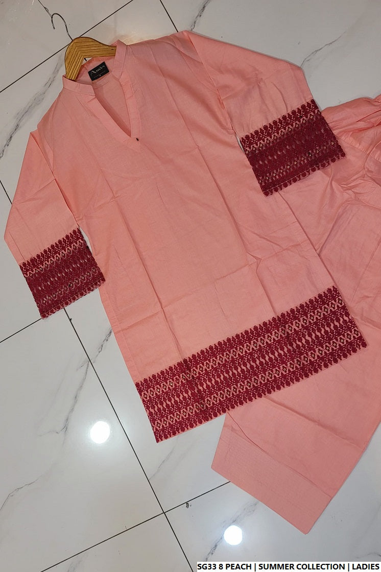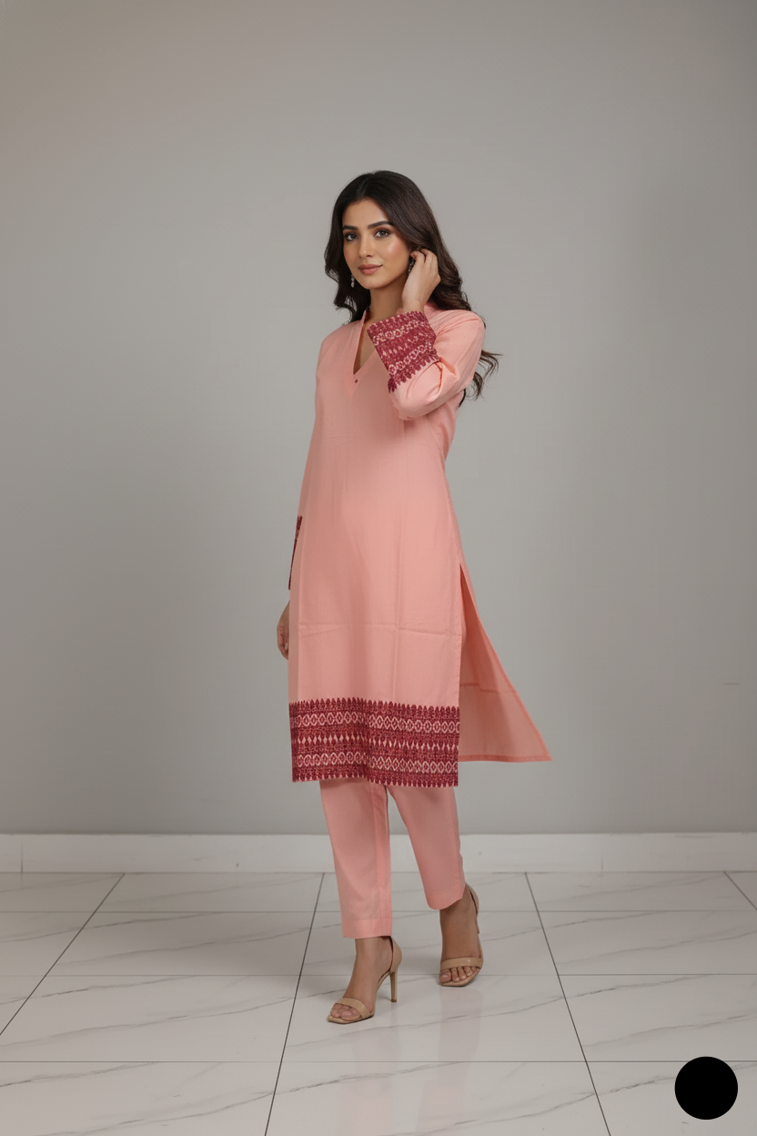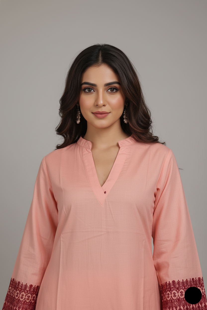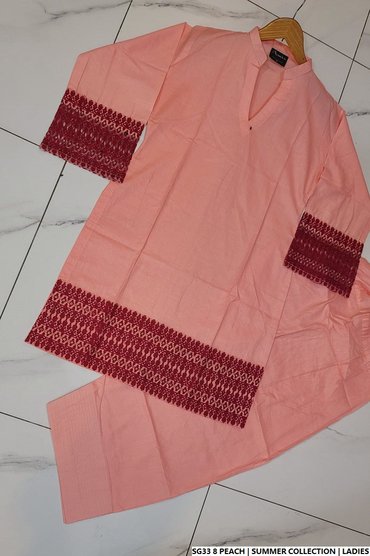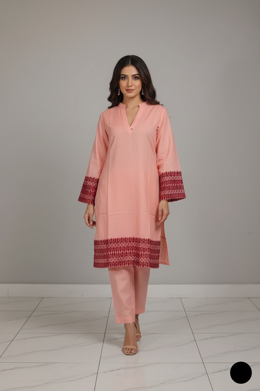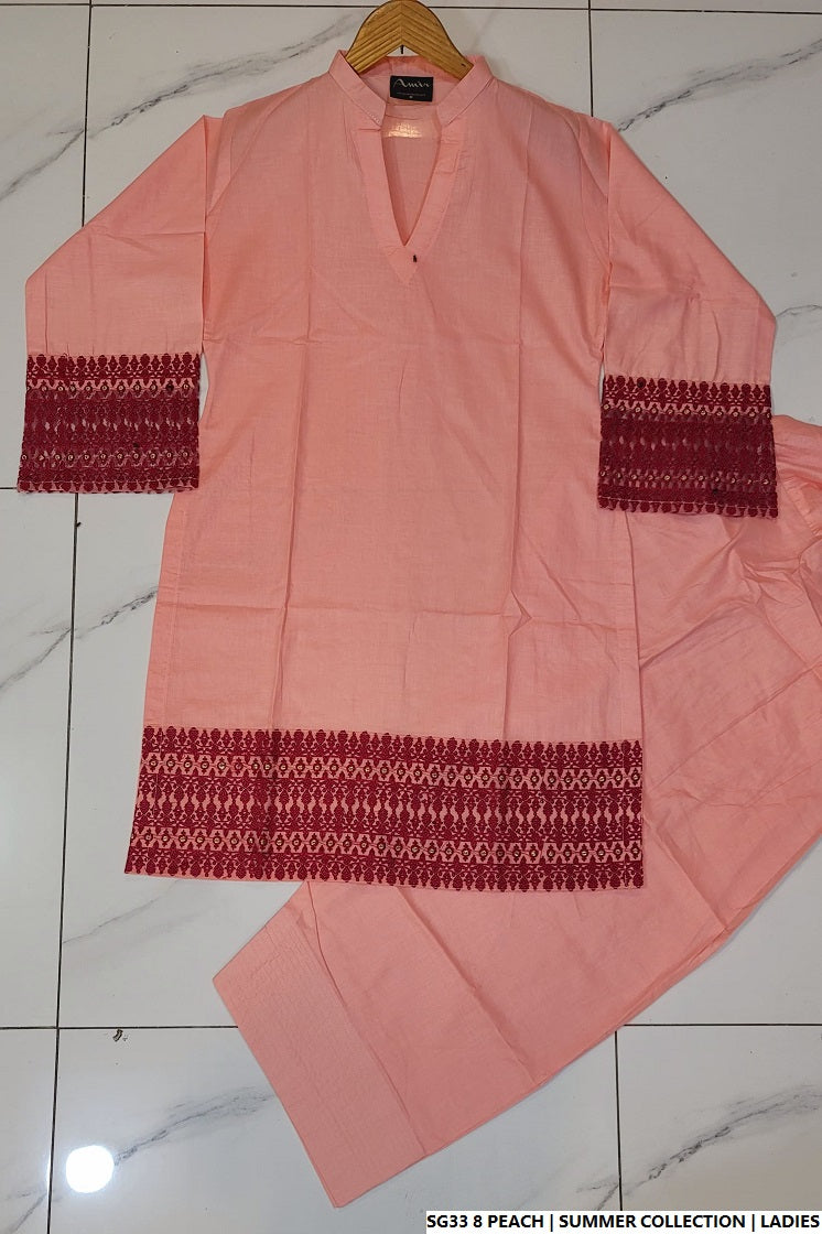 This beautiful outfit is crafted from soft cotton fabric, making it a perfect choice for all-day comfort. The straight shirt, paired with a classic farshi shalwar, offers a traditional yet elegant silhouette. It features a shirt length of 38 to 40 inches, allowing for modest coverage and a flattering fit. The two-piece completes the look, making it suitable for both casual and semi-formal occasions. Weighing just 0.450 kg, this ensemble is light, breathable, and easy to wear in warmer weather.