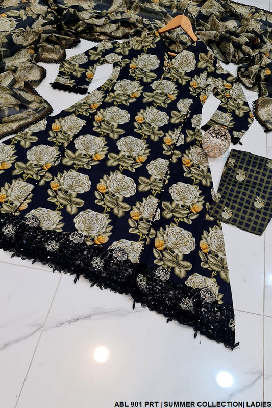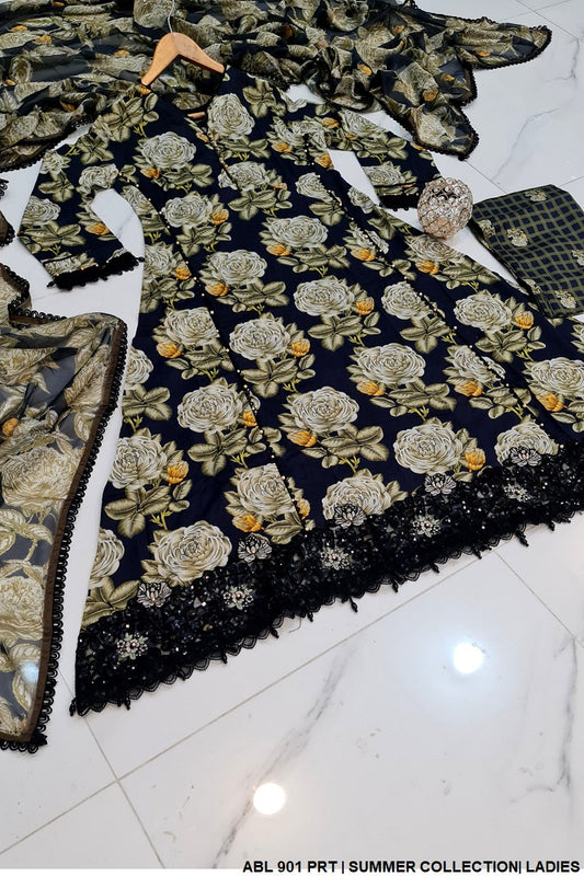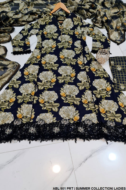 This charming 3-piece outfit showcases an elegant A-line frock made from breathable lawn fabric, perfectly paired with matching lawn trousers for all-day comfort. Completing the look is a beautifully digital printed dupatta, adding a pop of color and contemporary flair. With a shirt length of 48 to 50 inches and a total weight of just 0.650 KG, this ensemble offers a lightweight yet stylish option ideal for casual and festive wear.
