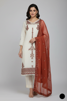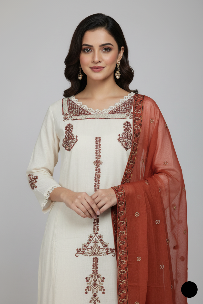 This elegant outfit features a straight shirt style crafted from soft and breathable cotton fabric, offering both comfort and sophistication. The shirt length measures 41 to 43 inches, providing a modest and flattering fit. Paired with cotton trousers for a coordinated look and completed with a lightweight chiffon dupatta, this ensemble is perfect for both casual and semi-formal occasions. With a total weight of 0.550 kg, it is easy to wear and manage throughout the day.