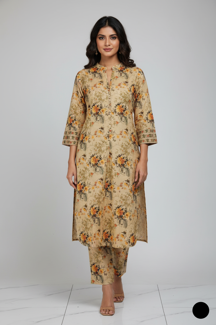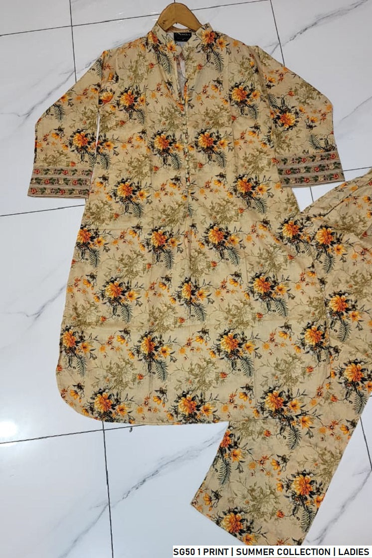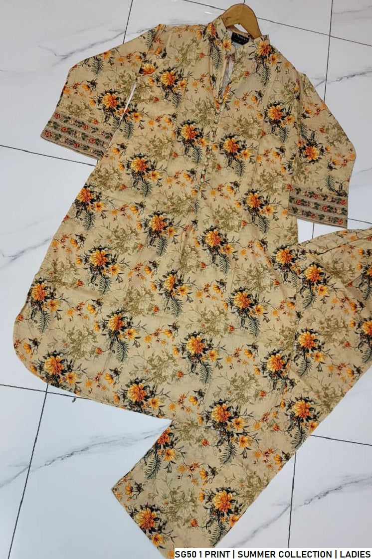This elegant outfit features a Goal Daman style shirt crafted from premium lawn fabric, ensuring breathability and comfort. The shirt length is approximately 42 to 44 inches, making it a versatile choice for various body types. The set includes a matching lawn trouser and a two-piece dupatta, perfect for both casual and semi-formal wear. Weighing just 0.350 kg, this ensemble is lightweight and ideal for everyday elegance.