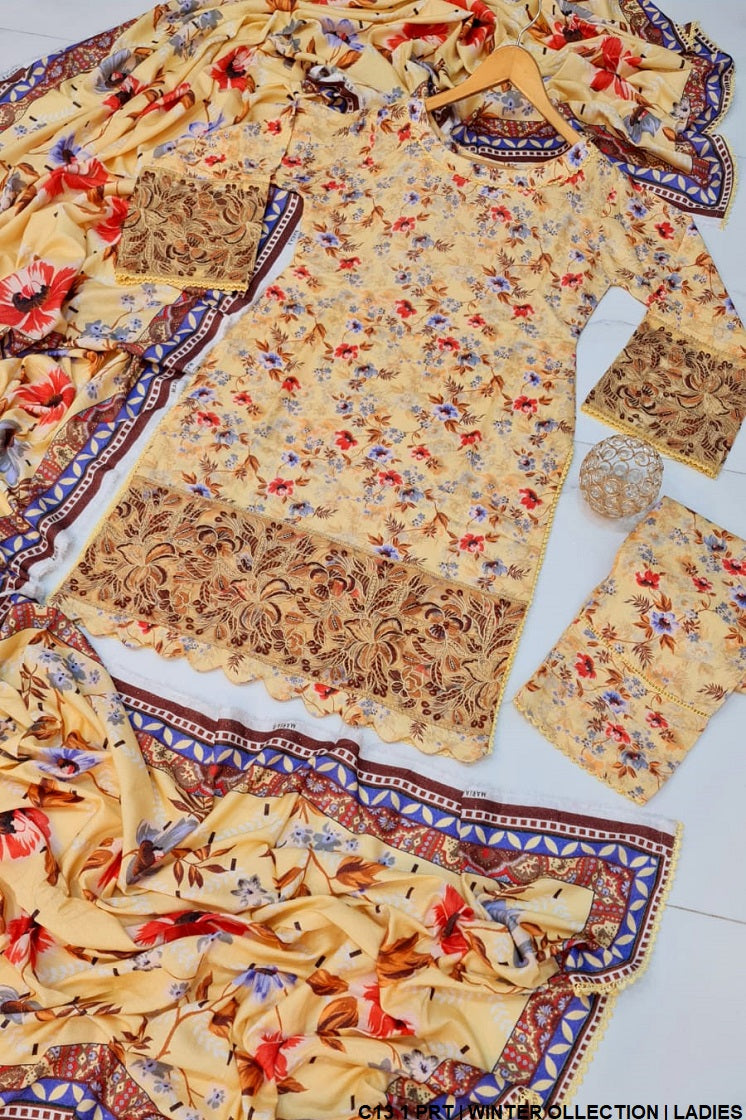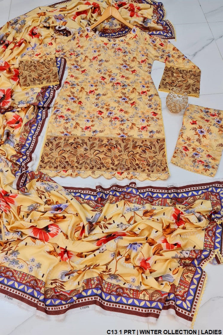 This stunning three-piece outfit is made entirely from premium Karandi fabric, celebrated for its rich texture and durability. The straight shirt style, with a length of 38/40 inches, exudes elegance and sophistication. Paired with matching Karandi trousers and a Karandi dupatta, this ensemble is perfect for achieving a polished and cohesive look. Weighing 0.750 kg, it offers a comfortable yet stylish choice for various occasions.