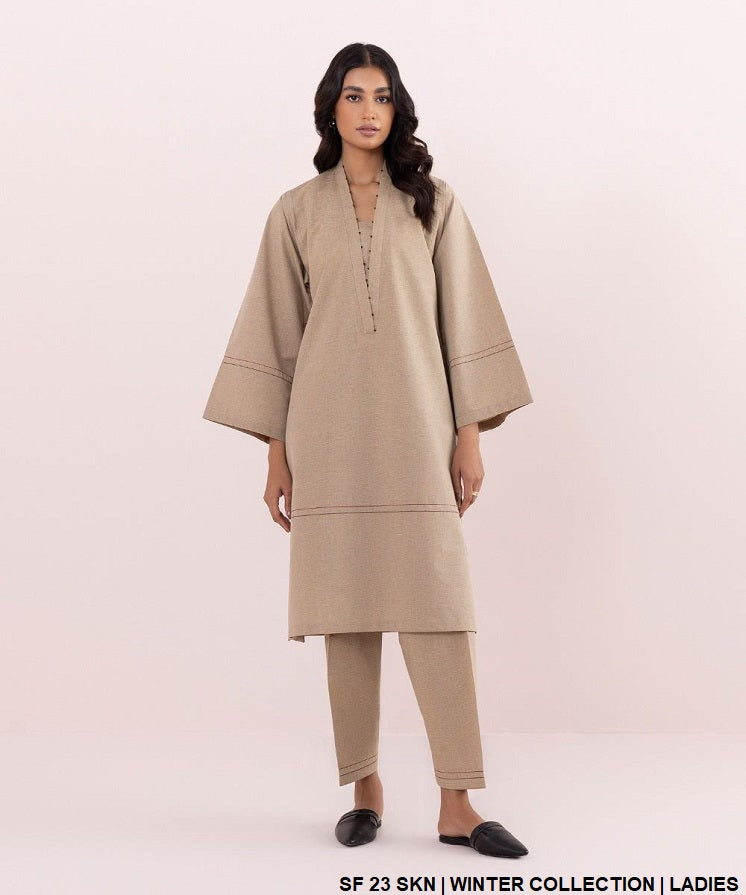 1. This A-line shirt is crafted from durable and comfortable Khaddar fabric, offering a perfect blend of style and practicality. Paired with a matching Khaddar trouser and a 2-piece suit, it ensures a complete and cohesive look. The shirt length of 42/44 inches provides a flattering fit, while its lightweight nature, weighing just 0.450 kg, adds to the comfort. Ideal for casual and semi-formal occasions, this outfit combines traditional craftsmanship with modern appeal.
