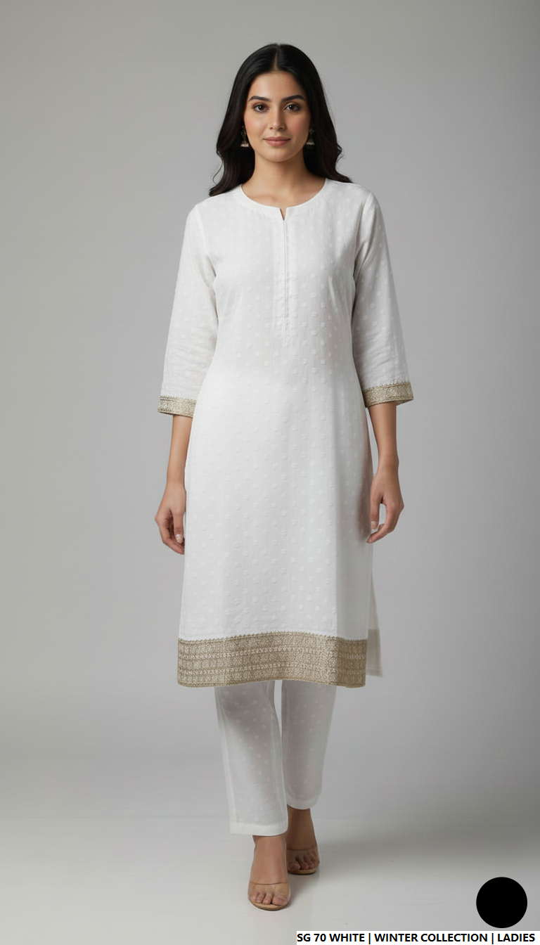 This beautifully crafted outfit features a premium jacquard shirt paired with matching jacquard trousers, offering a rich and elegant look. Designed in a straight-cut style, the shirt comes in a graceful 39/41 length, making it suitable for both formal and semi-formal occasions. Weighing 0.550 kg, the ensemble provides a luxurious feel while ensuring lasting comfort and style throughout the day.