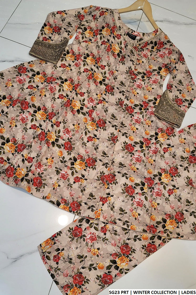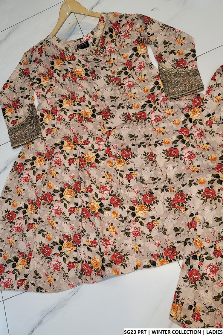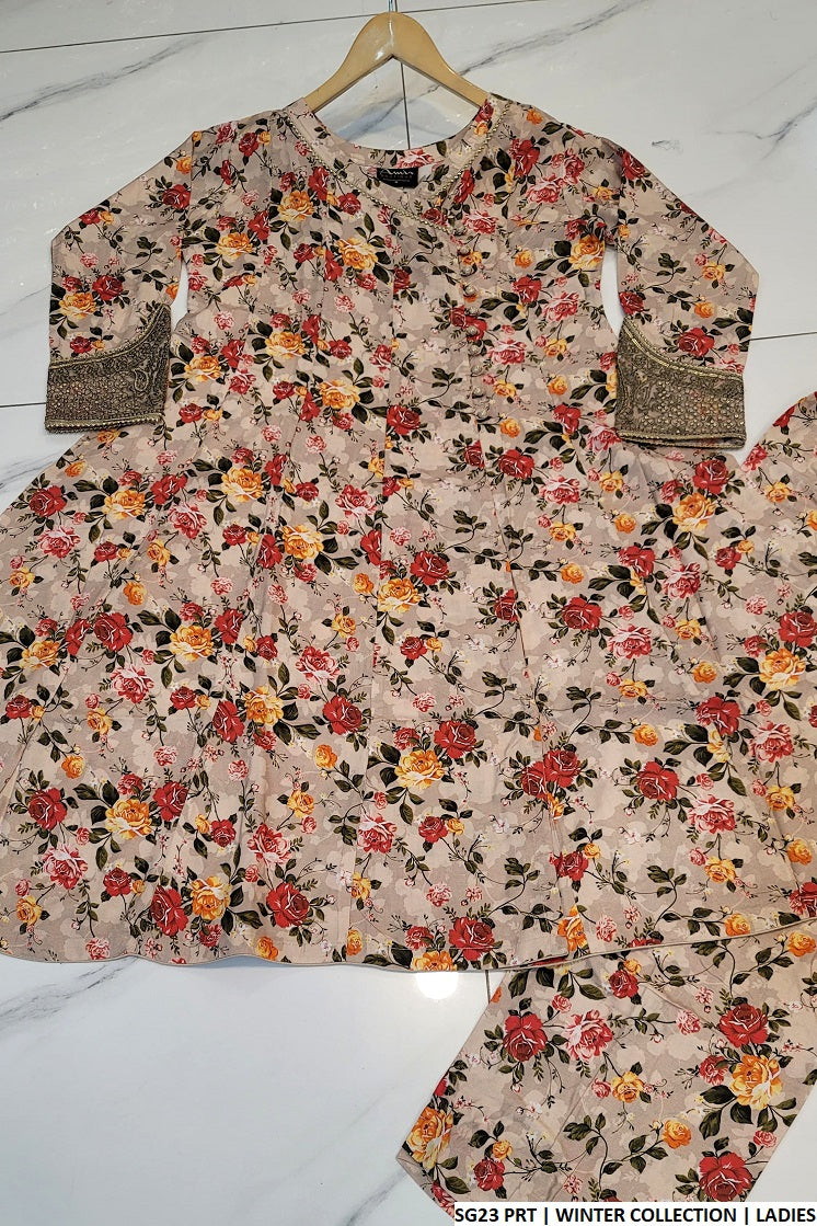 - This stylish outfit is crafted from high-quality **linen** fabric, featuring a charming **angrakha frock** design that combines elegance and tradition. The frock, with a length of **40 to 42 inches**, offers a flattering fit and graceful silhouette. It is paired with matching **linen trousers**, providing a coordinated and sophisticated look. The ensemble is complemented by a **2PC dupatta**, adding an extra layer of refinement. Weighing just **0.450 kg**, this lightweight outfit is ideal for casual and semi-formal occasions, offering both comfort and timeless style.