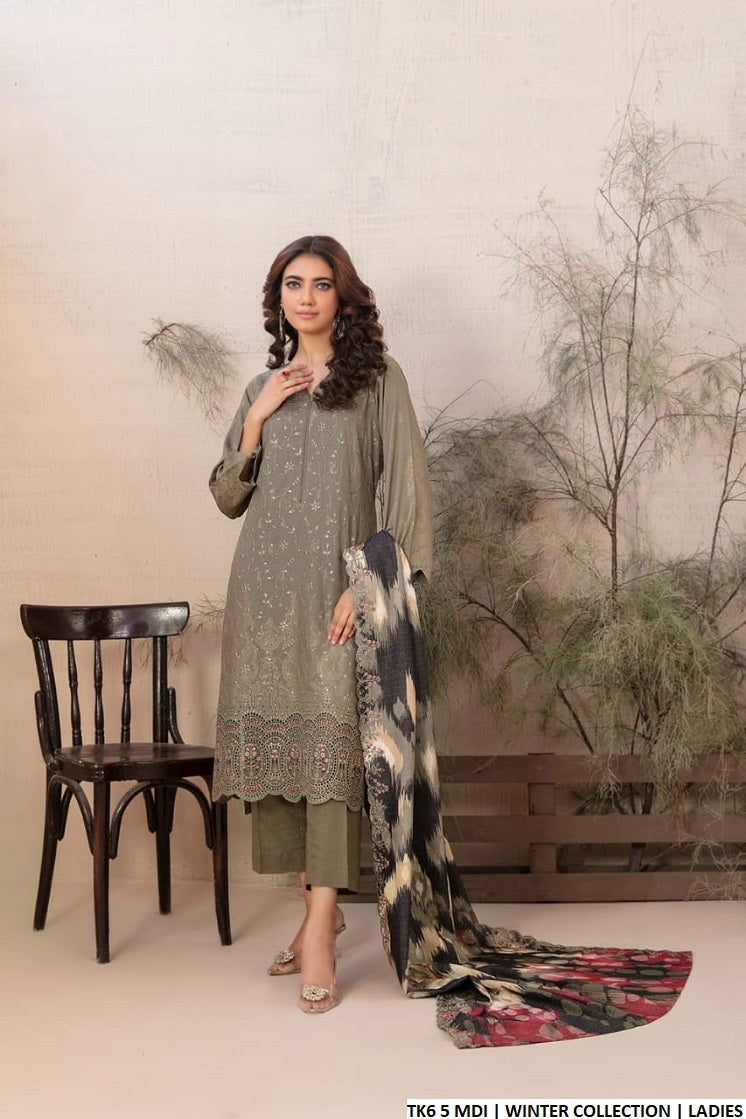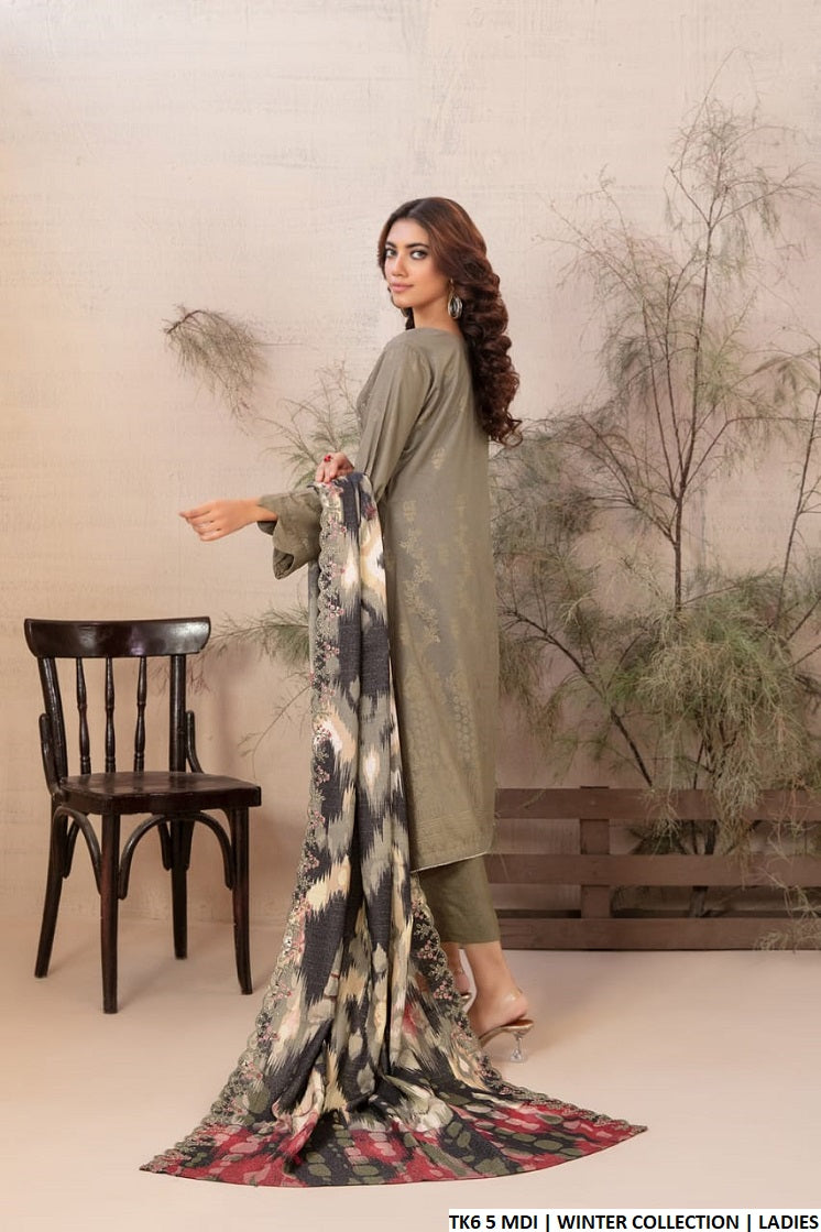 This sophisticated outfit is crafted entirely from high-quality Karandi fabric, known for its luxurious texture and durability. The ensemble features an A-line shirt style, offering a chic and flattering silhouette, with a shirt length of 40 to 42 inches for added elegance. Paired with trousers made from the same premium Karandi fabric, it ensures a harmonious and polished look. Completing the set is a matching Karandi dupatta, adding a traditional touch to this refined outfit. With a total weight of 0.900 kg, this ensemble perfectly balances style and substance, making it an ideal choice for formal and semi-formal occasions.