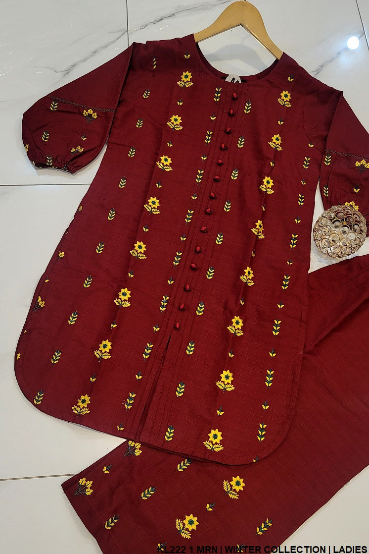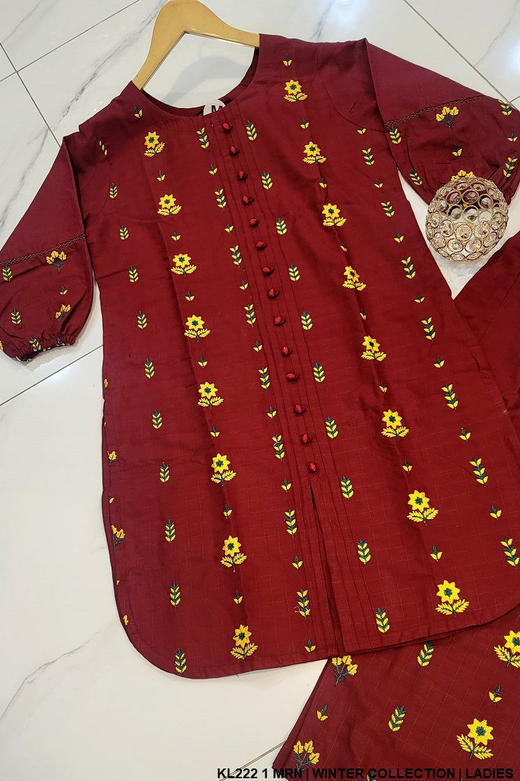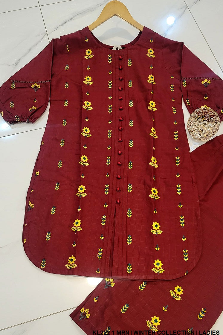 - This stylish outfit features a Goal Daman shirt made from cozy Winter Cotton, offering both comfort and warmth. The shirt comes in a length of 35/37 inches, providing a flattering fit. Paired with matching Winter Cotton trousers (plazo), this ensemble offers a chic and comfortable look, perfect for cooler weather. The set also includes a 2PC fabric dupatta, adding an elegant finishing touch to the attire. Weighing 0.500 kg, this fashionable outfit is ideal for those looking to combine style and comfort during the colder months.