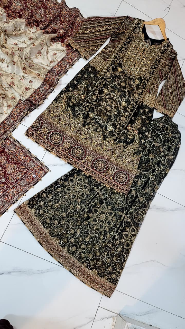 This elegant outfit features an A-line organza shirt paired beautifully with a net gharara and matching net dupatta. The shirt measures 45 to 47 inches in length, offering a graceful and traditional look perfect for festive or formal occasions. Weighing approximately 2 kg, this ensemble combines style and sophistication, making it a stunning addition to any wardrobe.