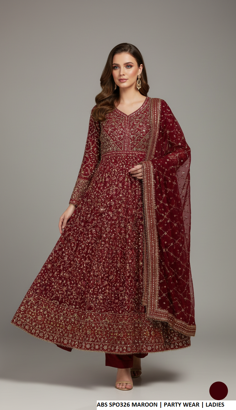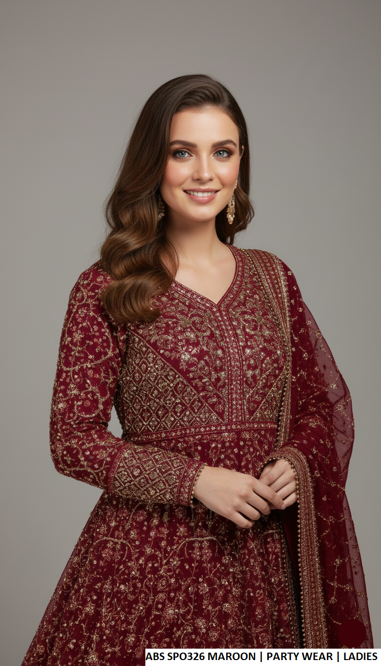This graceful long maxi outfit is designed with a chiffon shirt paired with comfortable viscose trousers and a matching chiffon dupatta. Styled in an elegant long maxi silhouette, it offers a flowing and flattering look ideal for formal gatherings and special occasions. The shirt length of 58/60 inches adds a regal touch, while the overall weight of approximately 1.650 kg reflects its premium fabric and detailed craftsmanship.
