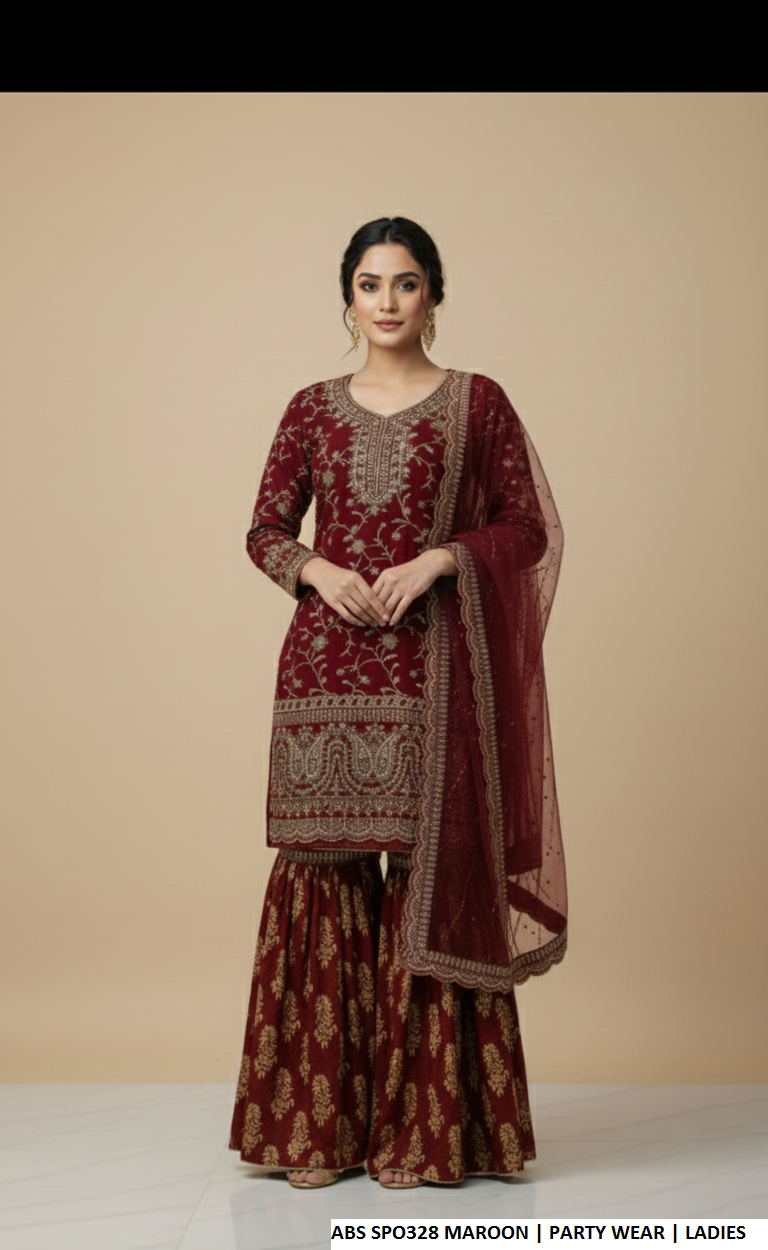 This stylish outfit features a chiffon short shirt paired with a flowy viscose sharara and a delicate organza dupatta. Designed in a trendy short shirt with sharara style, it offers a graceful yet contemporary look perfect for festive events and special occasions. The shirt length of 35/37 inches provides a flattering silhouette, while the lightweight construction with an approximate weight of 0.900 kg ensures comfort and ease of movement.