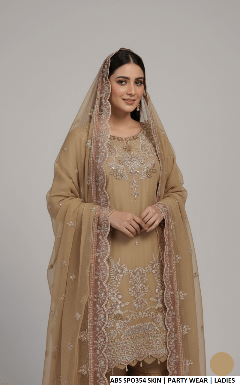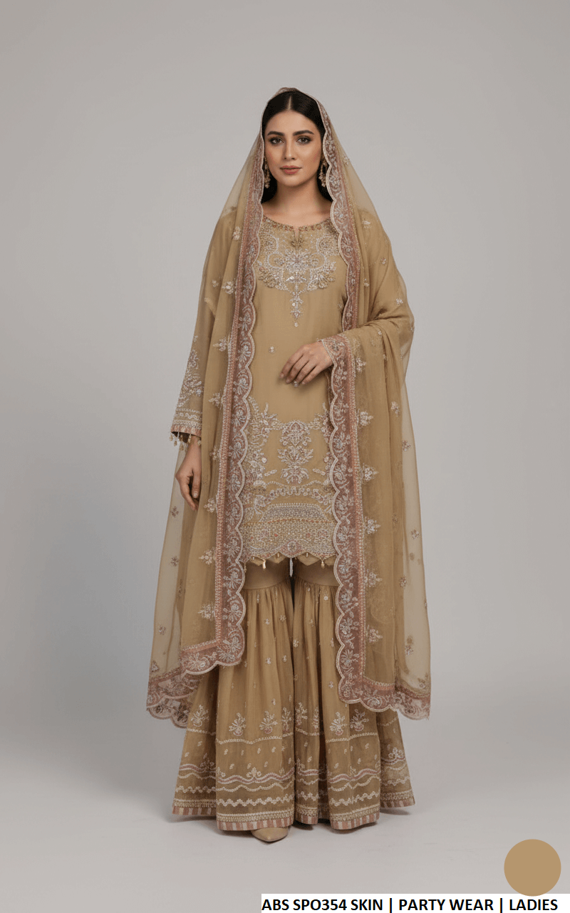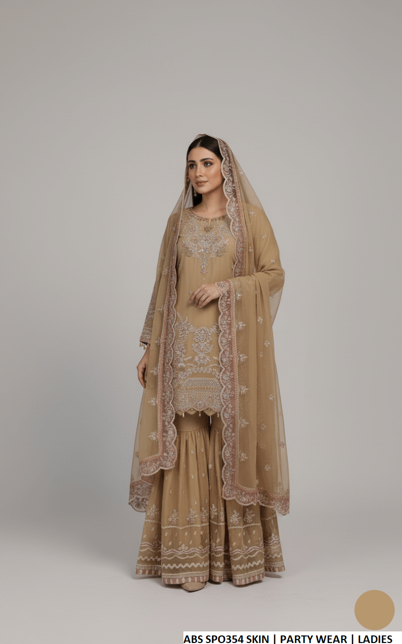 This stunning short shirt with sharara is beautifully crafted from premium chiffon fabric, giving it a soft, flowy, and elegant look. The fully chiffon ensemble creates a graceful silhouette that is perfect for festive occasions, weddings, and formal gatherings. With a shirt length of 34 to 36 inches and a balanced weight of 1.00 KG, this outfit offers both comfort and sophistication for special events.