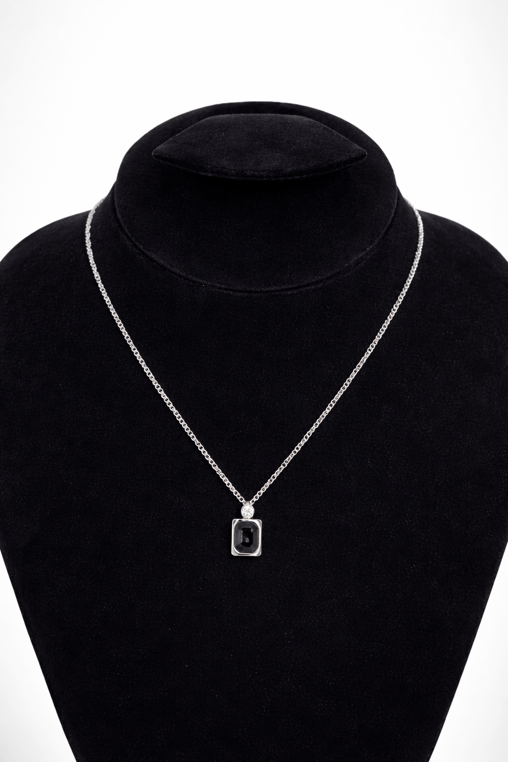 Meet JW23, a sleek and modern silver-tone necklace featuring a bold rectangular black stone pendant. Designed with a clean metallic frame and subtle top accent detail, this piece delivers a strong yet sophisticated look.