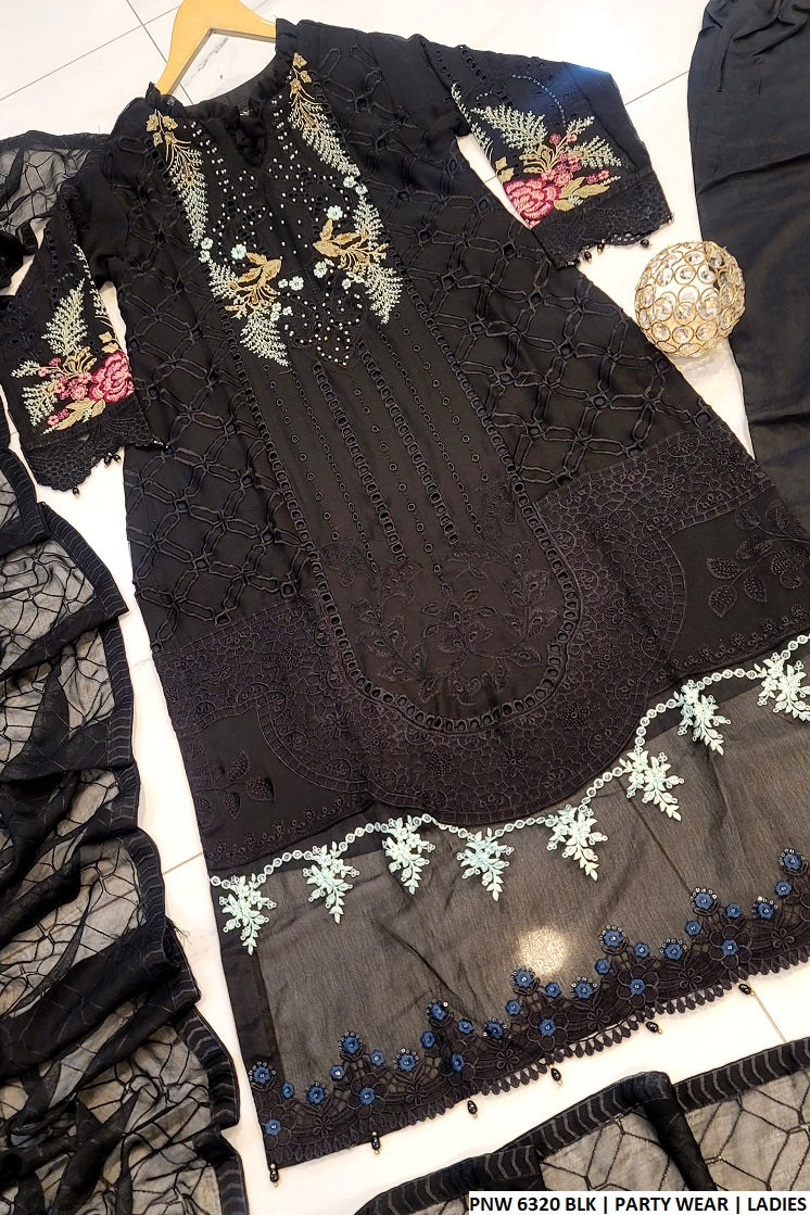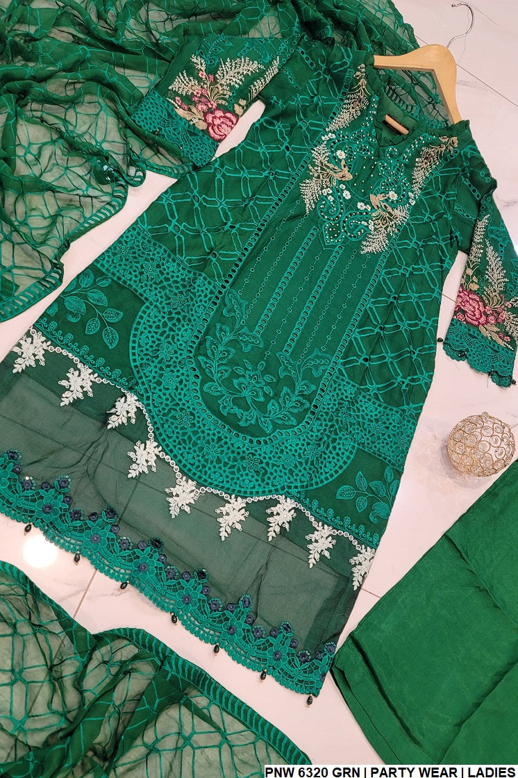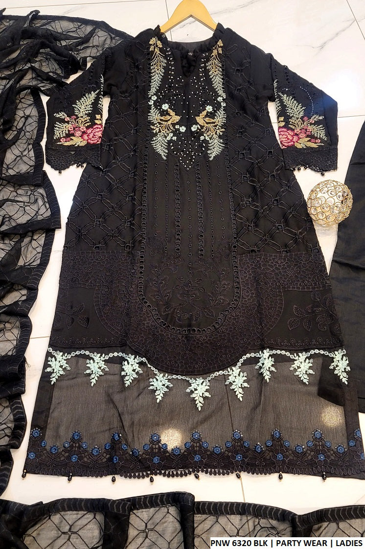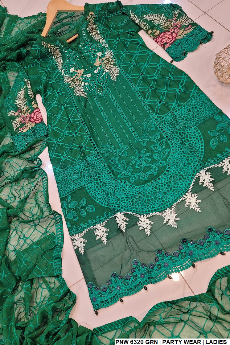 - This graceful outfit features an A-line shirt made from chiffon, offering a light, flowy, and elegant silhouette. The shirt is paired with trousers made from grip fabric, which provides a structured and flattering fit. The dupatta, crafted from organza, adds a delicate, airy touch to the ensemble. Available in shirt lengths of 42 and 44 inches, the outfit offers versatility for different preferences. Weighing 0.650 kg, this ensemble combines comfort with sophistication, making it a perfect choice for formal occasions or special events.