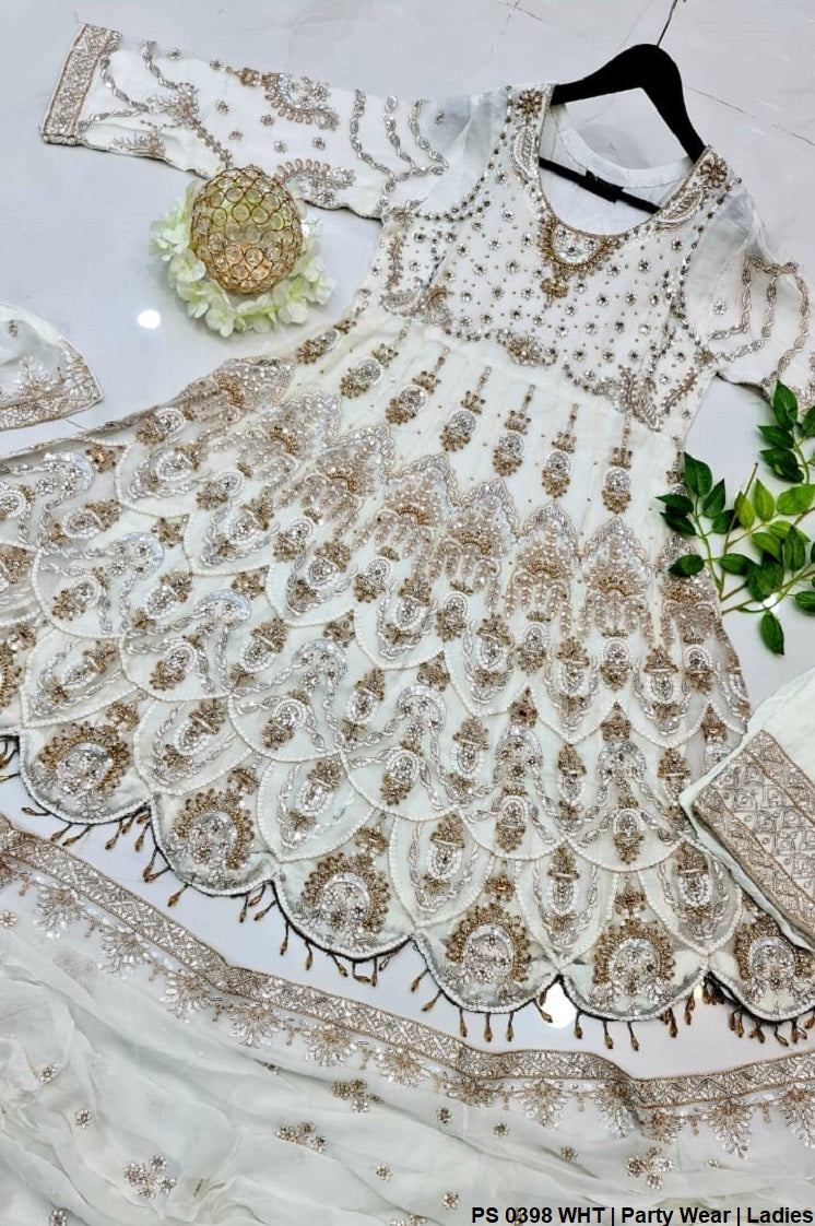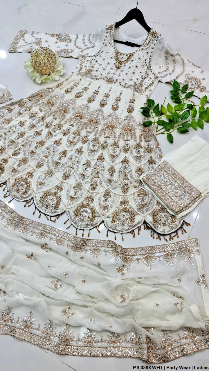 - The outfit is crafted from a combination of chiffon and grip fabrics. The shirt and dupatta are made from chiffon, offering a delicate and lightweight texture, while the trouser is made from grip fabric for a more structured feel. The style of the outfit is a frock, which adds a flowy and elegant touch. The shirt length is available in two options, 39 and 41 inches, and the overall weight of the ensemble is 1.00 kg, making it both comfortable and stylish for various occasions.