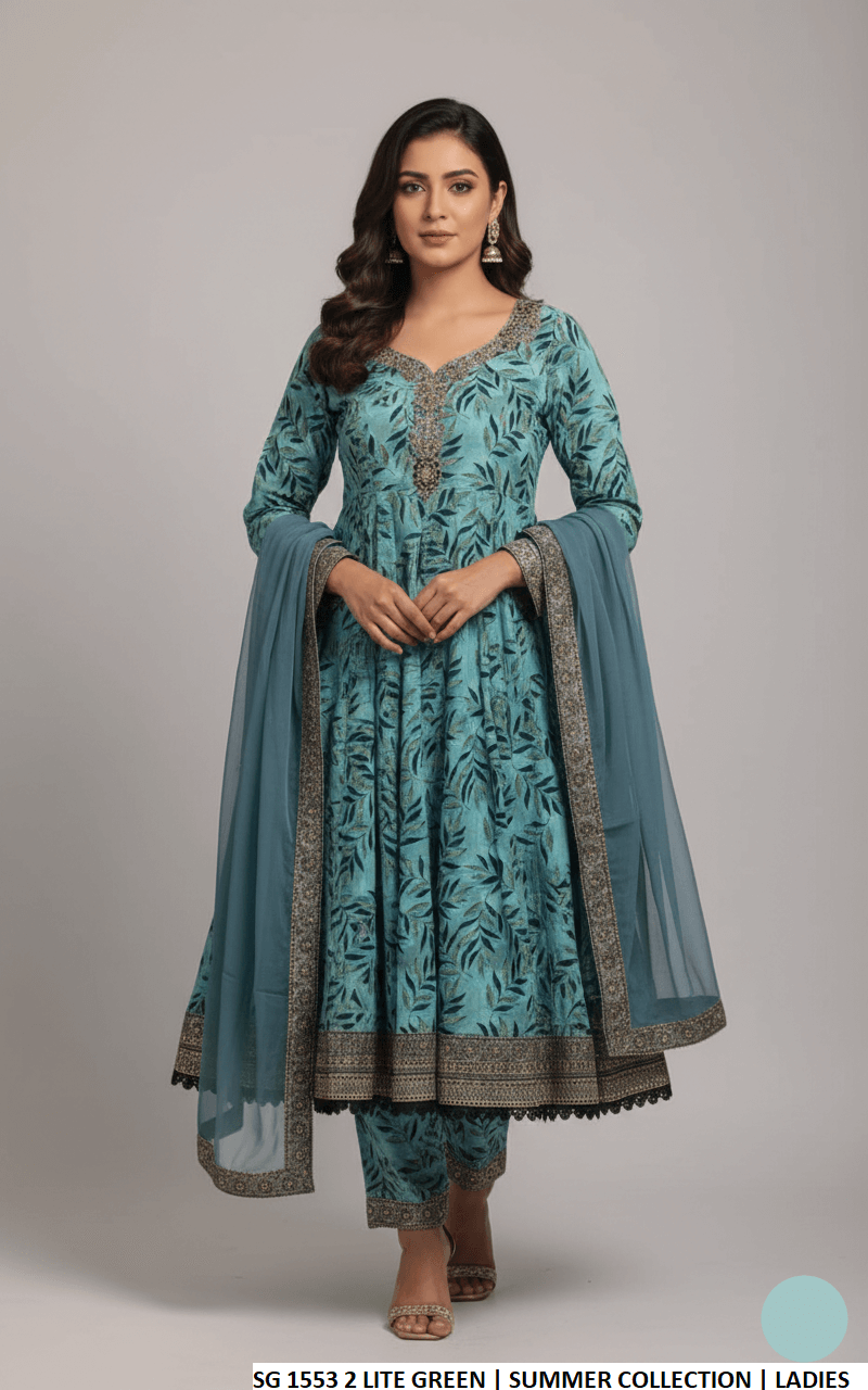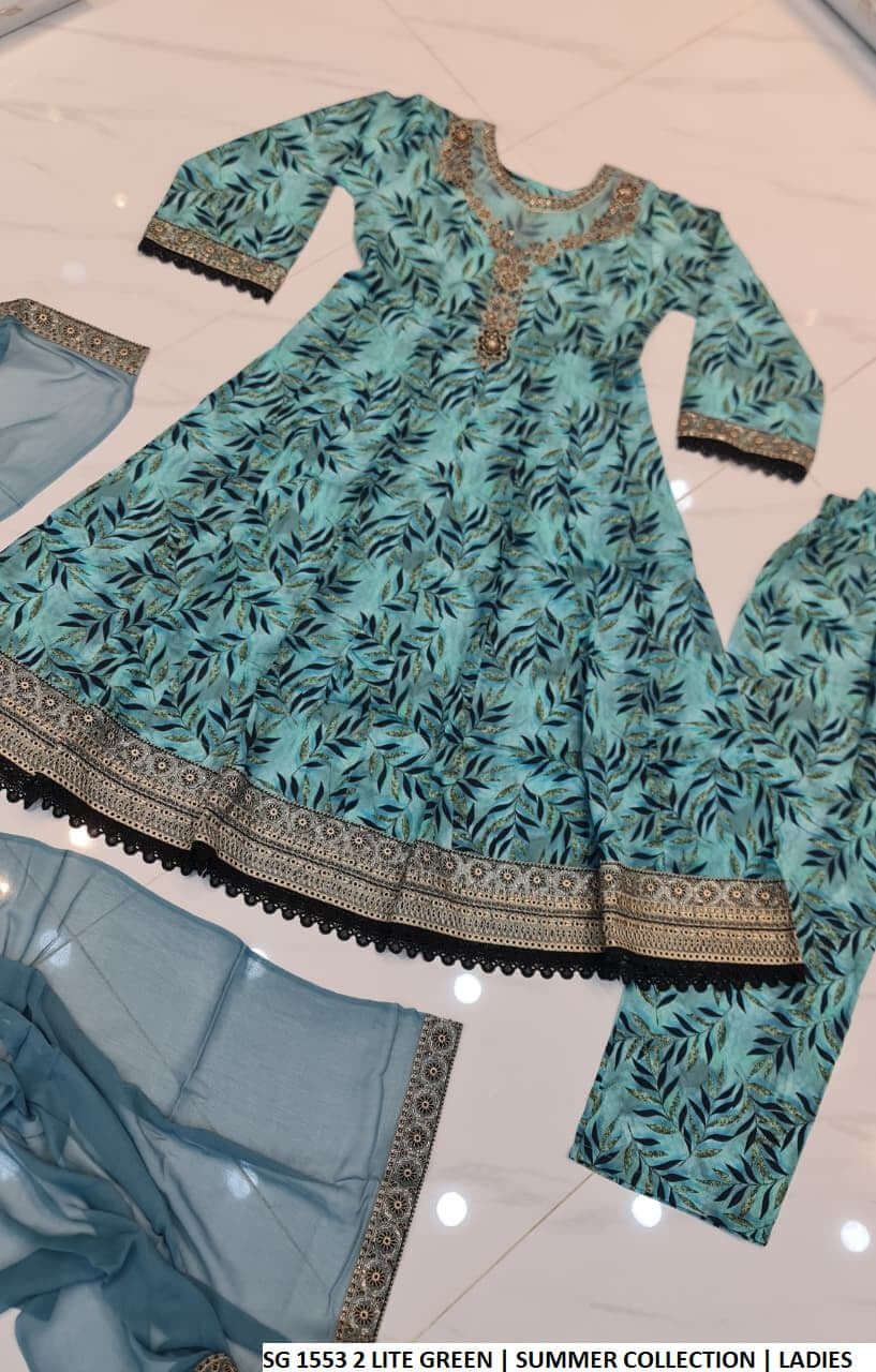 This beautiful outfit is made from soft and breathable lawn fabric for both the shirt and trouser, ensuring comfort throughout the day. The elegant chiffon dupatta adds a light and graceful touch to complete the look. Designed in a long frock style with a length of 46 to 48 inches, this outfit offers a flowing and flattering silhouette. With a lightweight feel of 0.600 KG, it is perfect for summer wear, casual gatherings, and daytime events.
