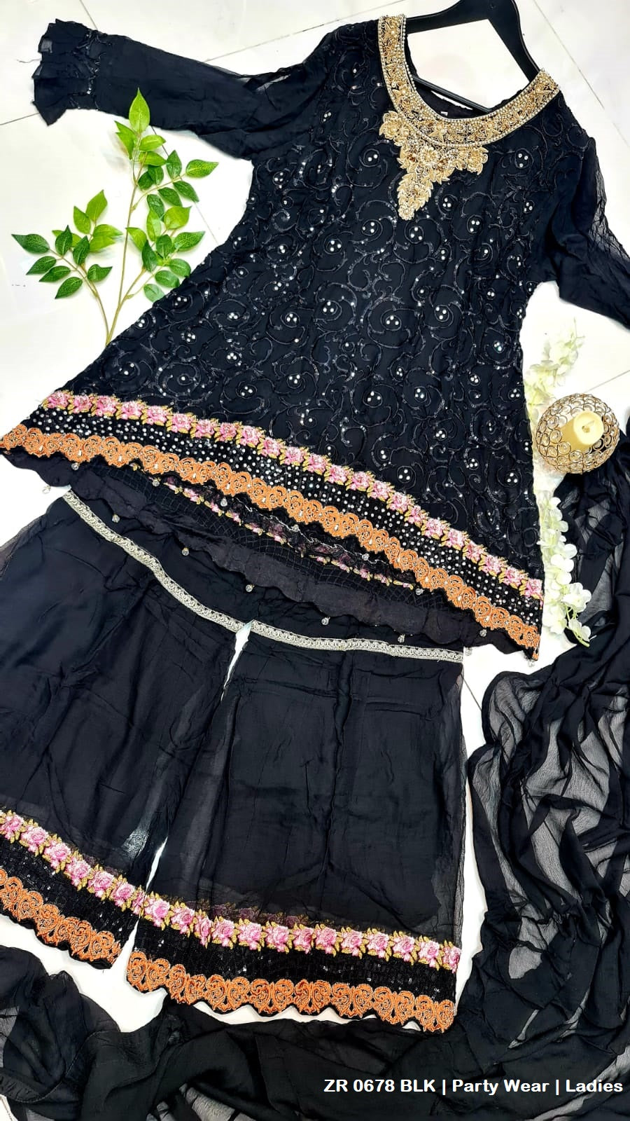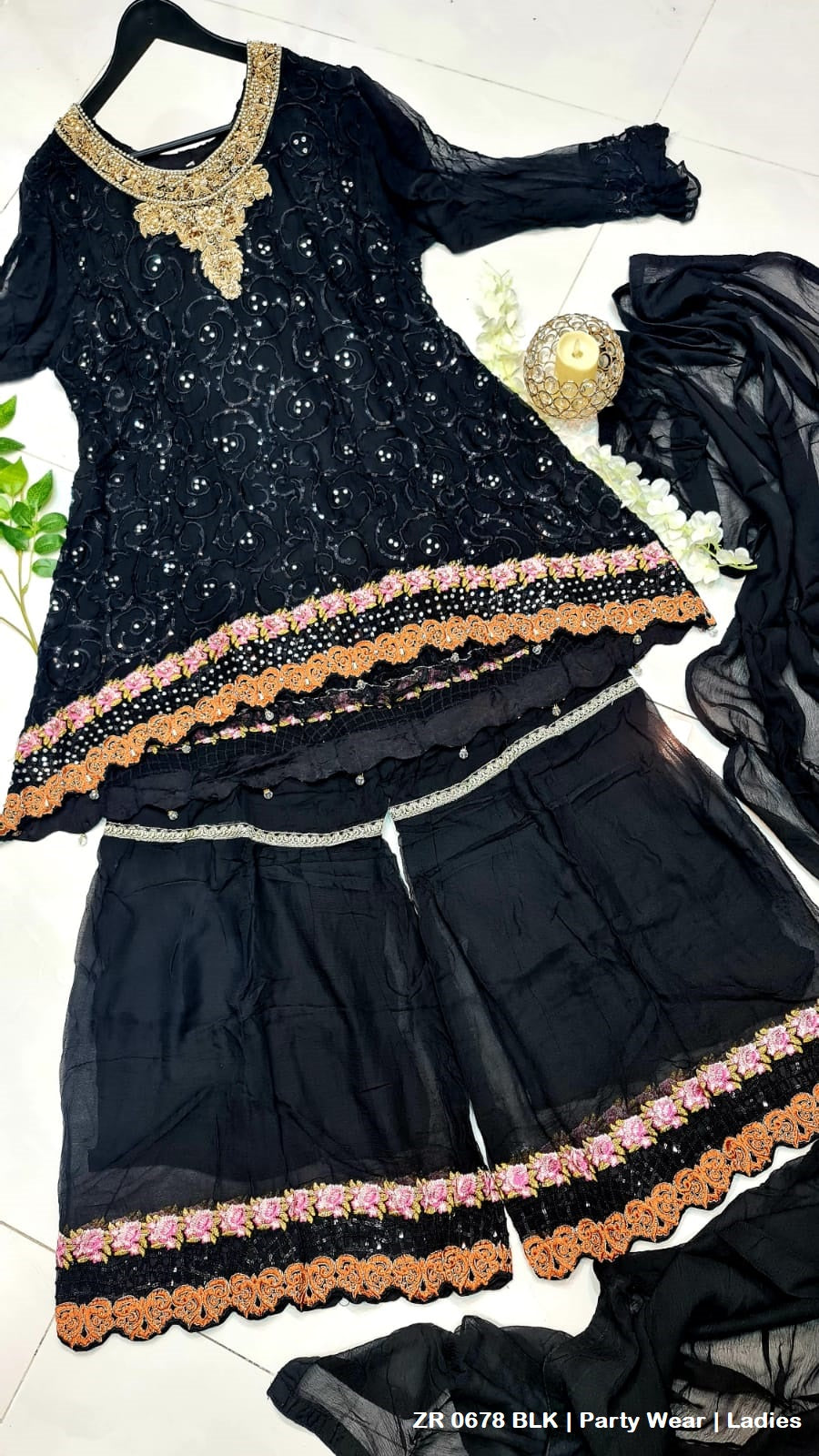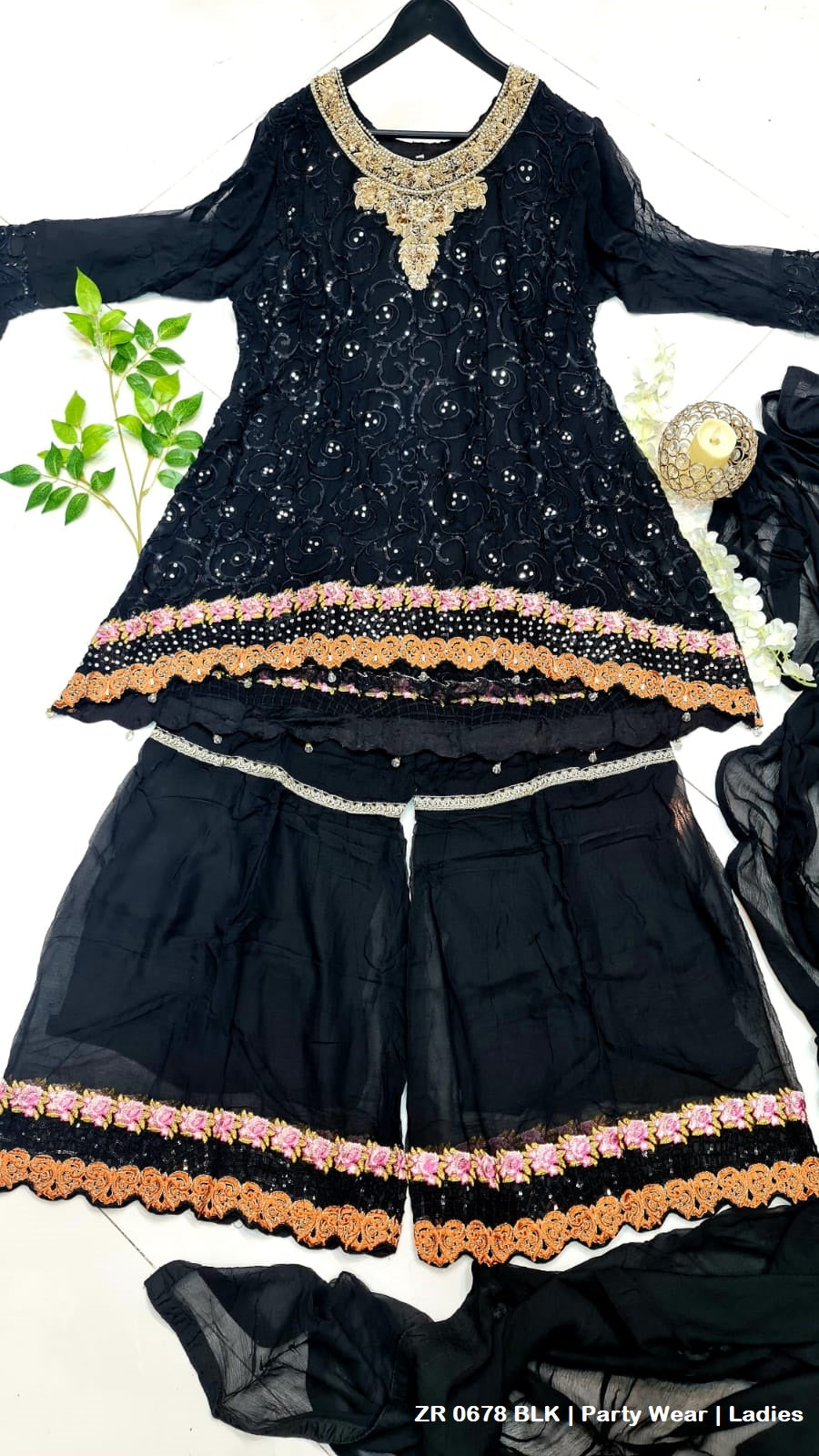 - This outfit features a chiffon shirt and dupatta, paired with a stylish gharara made from chiffon. The shirt is designed with a length of 32 inches, offering a flattering fit. The gharara adds a traditional and elegant touch, making the ensemble perfect for special occasions. The lightweight chiffon fabric ensures comfort, while the entire set weighs 1.00 kg, balancing elegance with practicality.
