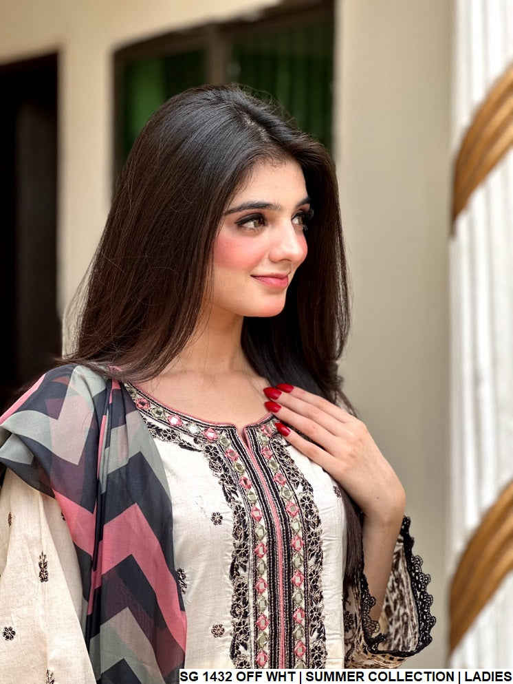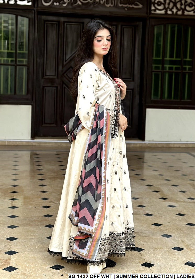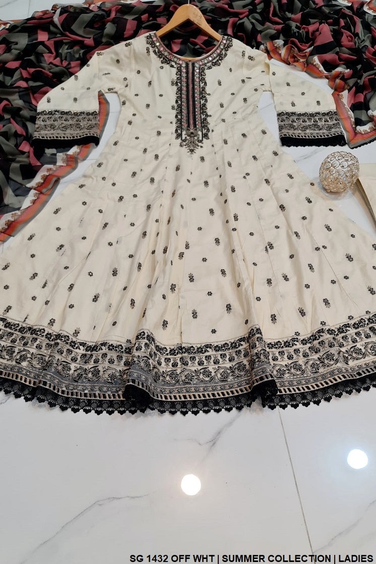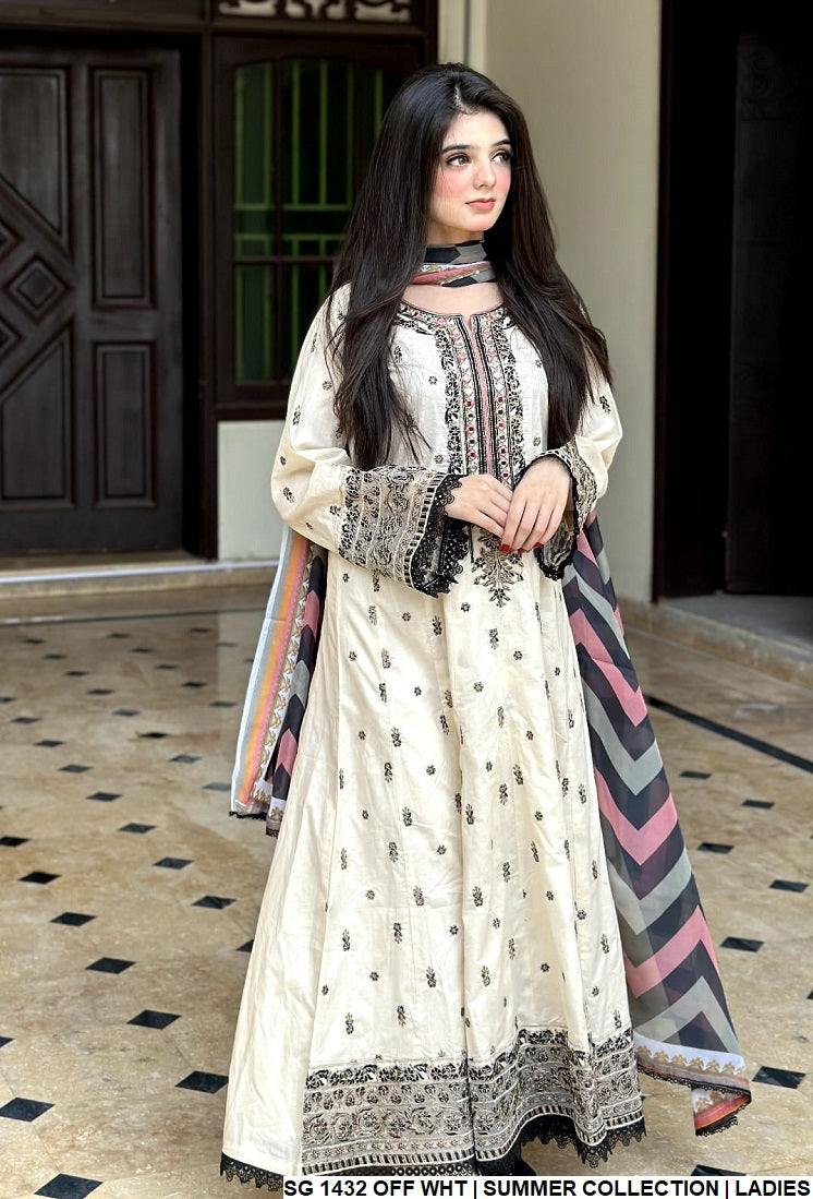 This elegant frock-style outfit is crafted from soft, breathable cotton fabric, offering both comfort and style for any occasion. The shirt, available in lengths of 51 or 53 inches, creates a flattering and graceful silhouette. It’s paired with matching cotton trousers for a coordinated and chic appearance. Adding a modern twist to the traditional look is the digital printed dupatta, enhancing the outfit’s visual appeal. With a lightweight feel of just 0.800 KG, this ensemble is ideal for casual or semi-formal events, seamlessly combining ease and sophistication.