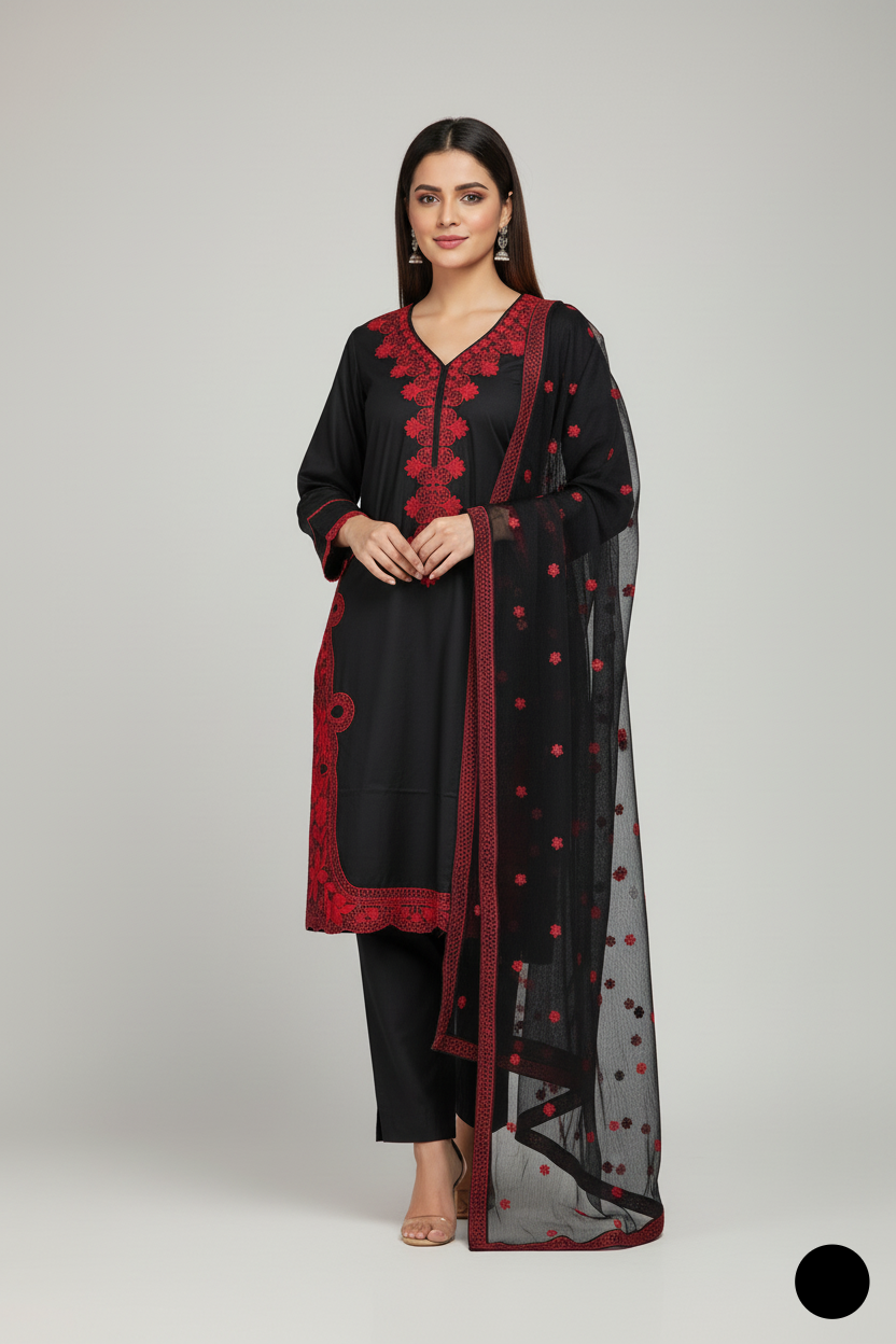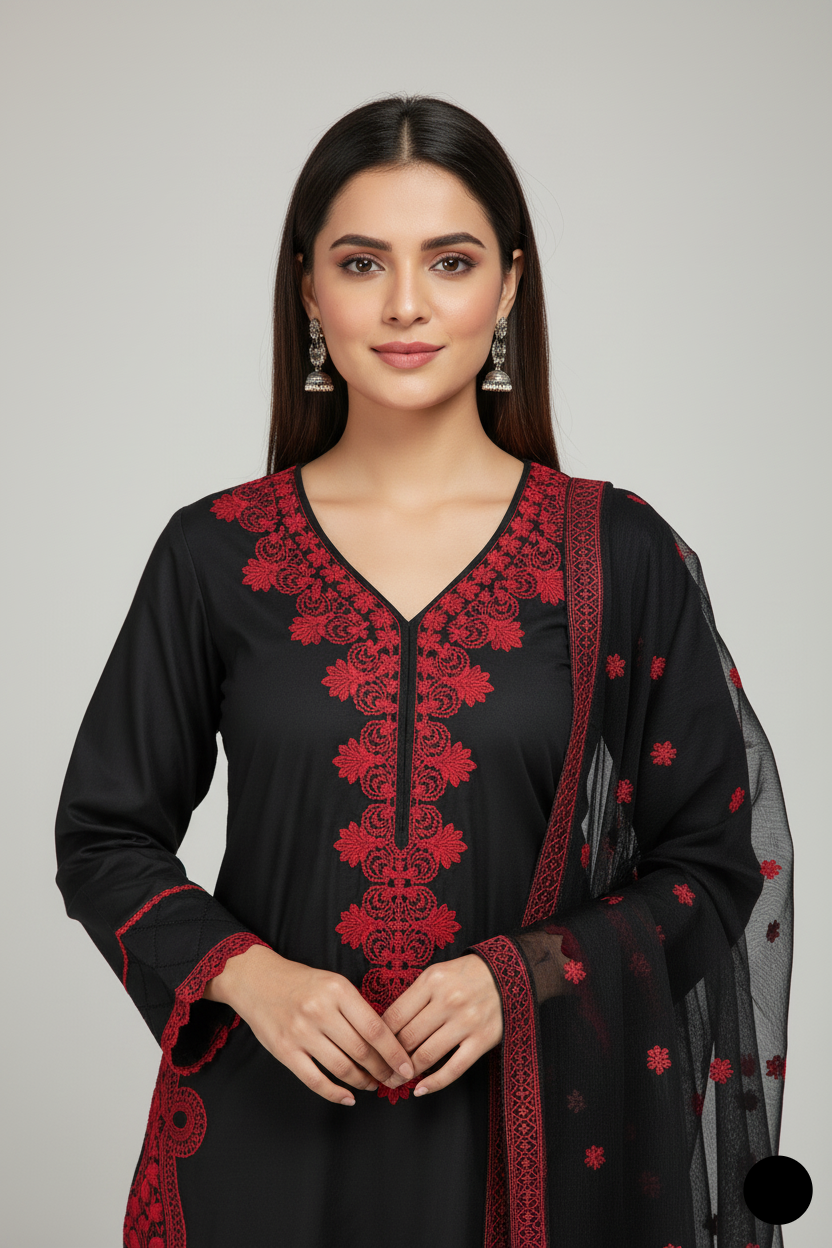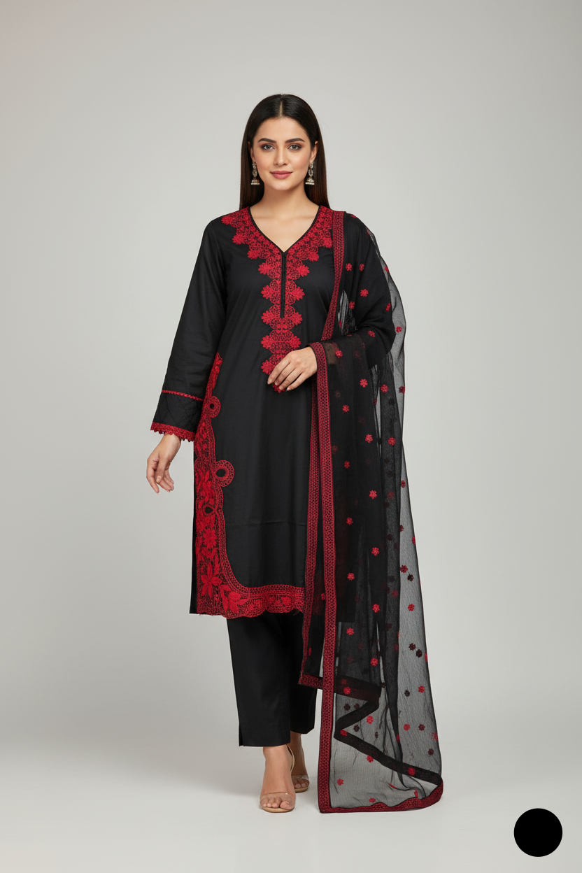 This beautifully tailored 3-piece outfit features a straight shirt made from breathable cotton fabric, ideal for all-day comfort. The shirt length ranges from 40 to 42 inches, offering a graceful and flattering fit. The ensemble includes cotton trousers that perfectly complement the shirt, while a lightweight and flowy chiffon dupatta adds a touch of elegance. With a total weight of just 0.500 kg, this outfit is lightweight and easy to carry, making it perfect for both everyday wear and casual outings.