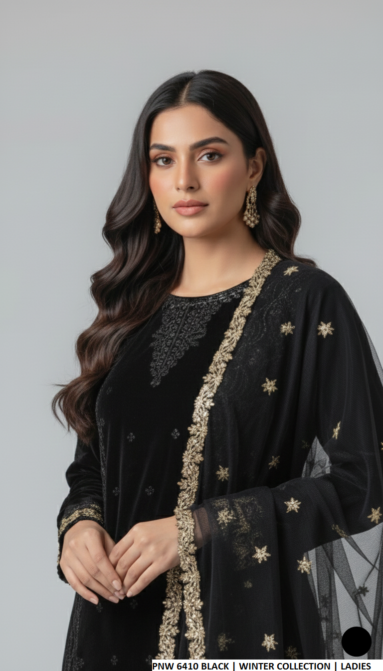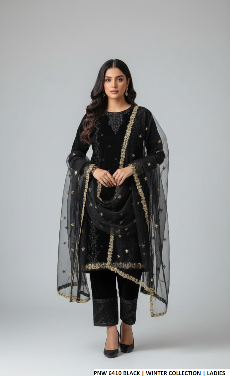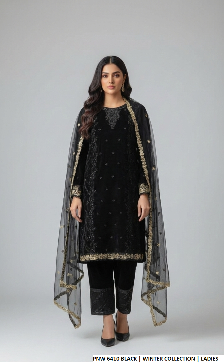 This stylish outfit features a luxurious velvet shirt paired with matching velvet trousers, creating a rich and elegant appearance. The look is completed with a delicate organza dupatta that adds a soft, graceful touch. Designed in a shirt with plazoo style, the shirt length of 40/42 inches offers a flattering silhouette suitable for formal and festive occasions. With an approximate weight of 0.750 kg, the outfit is lightweight yet refined for comfortable wear.