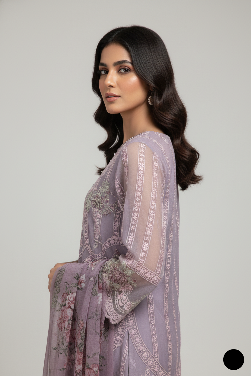 This stylish ensemble includes a chiffon straight shirt, grip fabric plazo trousers, and a beautifully printed digital chiffon dupatta. The shirt length ranges from 41 to 43 inches, offering a modern and flattering fit. Weighing only 0.650 kg, the outfit is lightweight and comfortable, making it ideal for formal events or festive wear. The digital chiffon dupatta adds a contemporary flair to this classic design, enhancing the overall elegance of the look.
