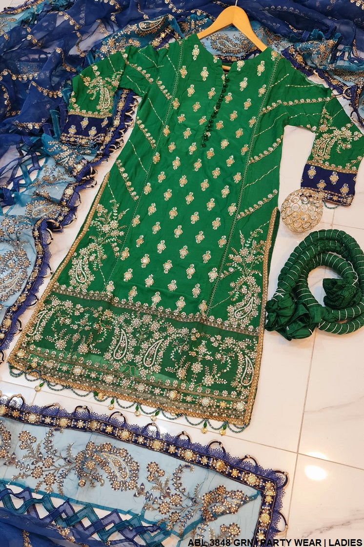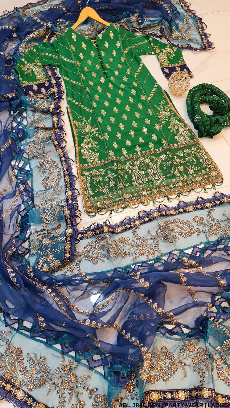 This elegant ensemble features a straight shirt with a sharara, exuding grace and sophistication. The shirt is crafted from chiffon fabric, giving it a soft and flowy appearance, while the trouser is a crushed sharara, adding a touch of volume and texture to the outfit. Complementing the look is a delicate organza dupatta, enhancing its charm with a sheer, lightweight feel. The shirt length ranges from 44 to 46 inches, ensuring a balanced silhouette, and the overall weight of the outfit is approximately 1.450 kg, making it a statement piece for any occasion.