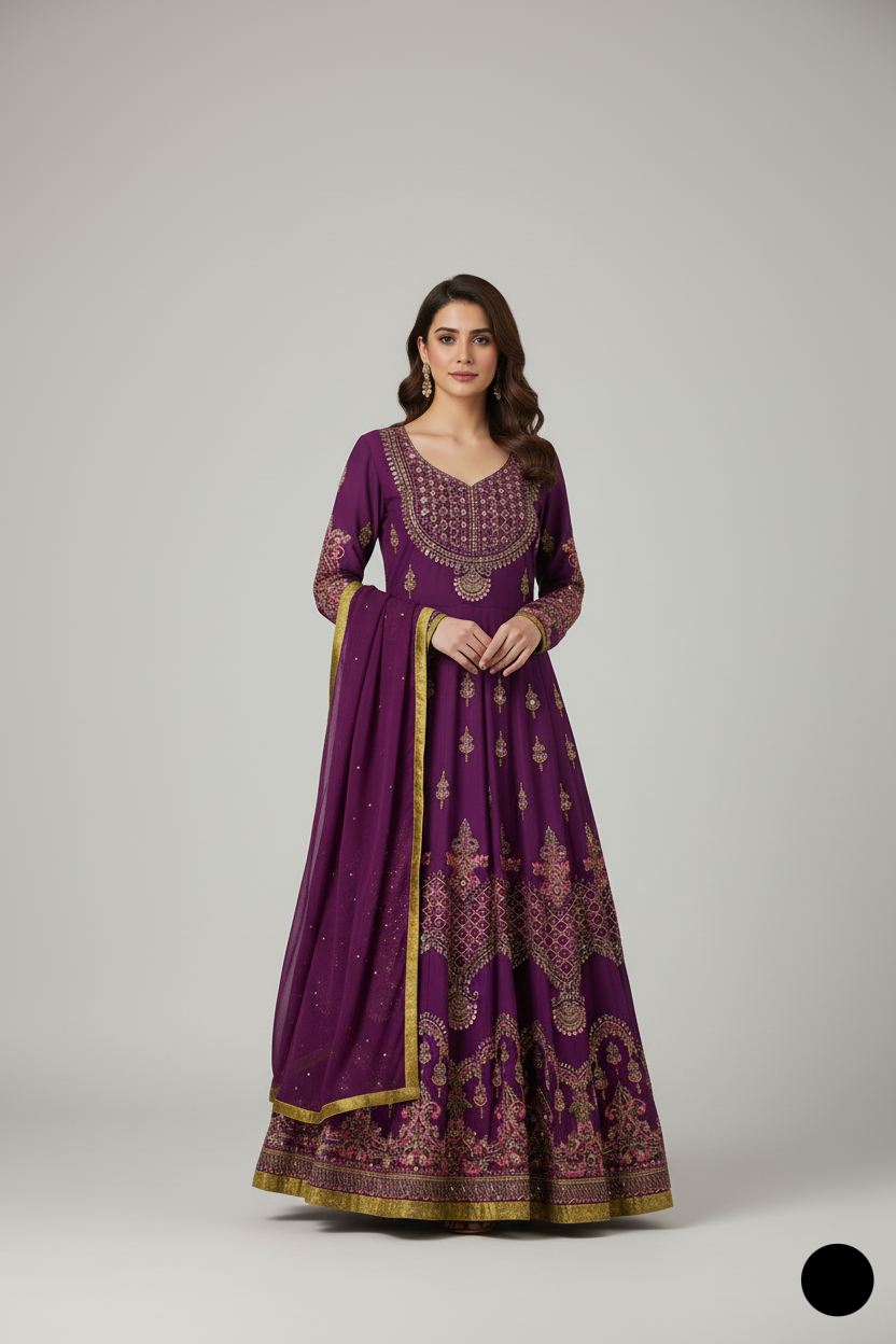 This beautifully designed outfit features a graceful chiffon long frock, paired with a soft and comfortable grip trouser for a flattering silhouette. The look is completed with a matching chiffon dupatta, adding elegance and flow to the ensemble. With a shirt length of 51/53 inches and a total weight of 1.000 kg, this outfit is ideal for formal events, festive gatherings, or special occasions where comfort meets sophistication.