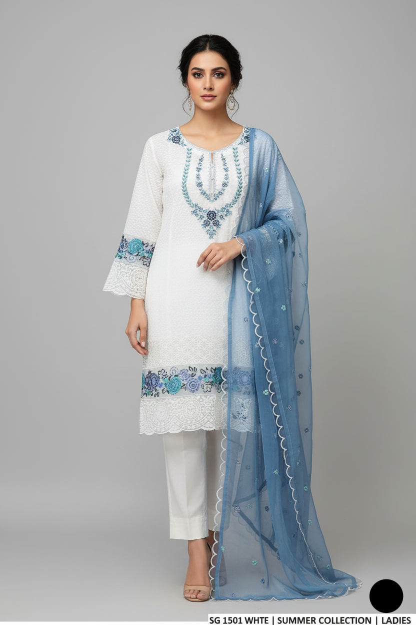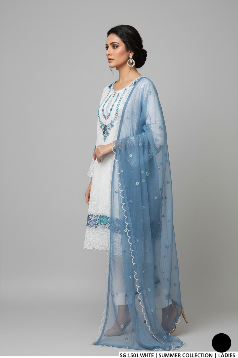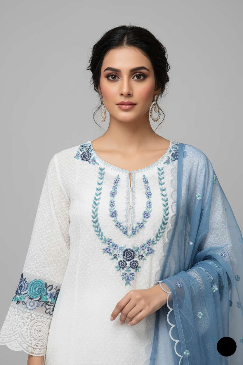 This beautifully crafted outfit features a classic cotton shirt paired with a traditional farshi shalwar, both made from high-quality cotton for comfort and breathability. The look is enhanced with a flowing chiffon dupatta, adding a touch of elegance. With a shirt length of 36 to 38 inches and a total weight of just 0.650 kg, this ensemble is perfect for those who value lightness, tradition, and timeless style.
