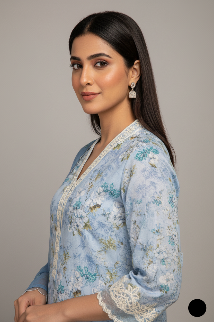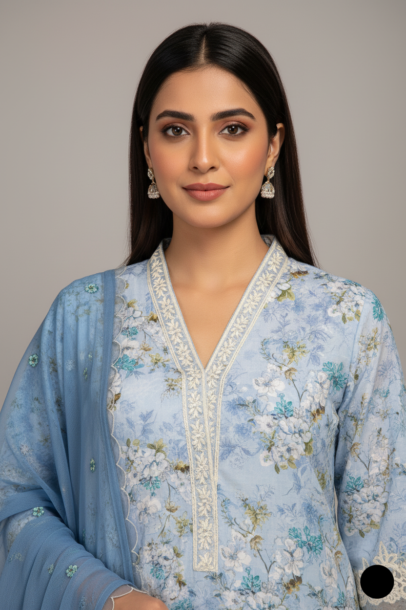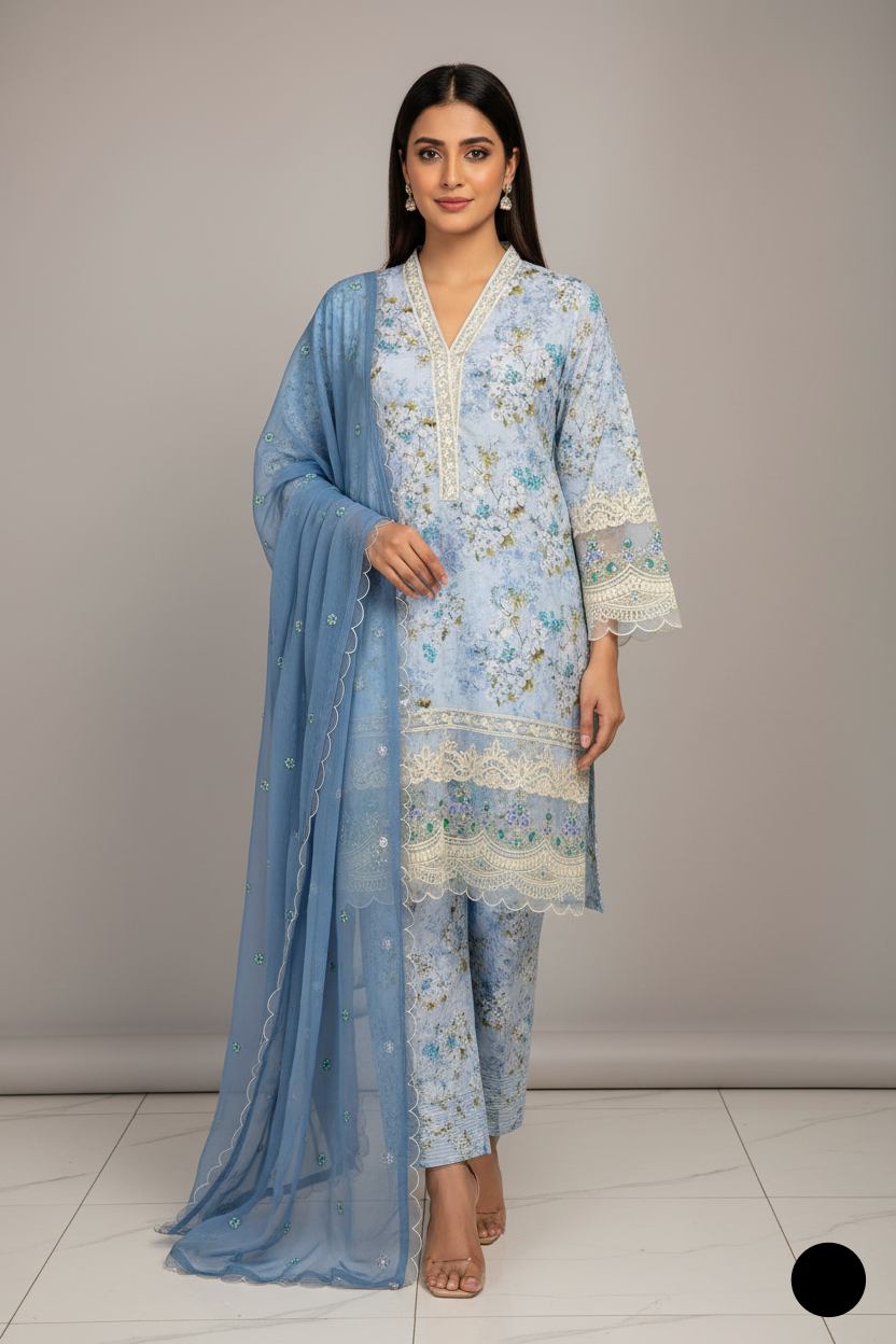 Step into effortless elegance with this stylish straight shirt and farshi shalwar ensemble. Made from breathable lawn fabric for both the shirt and trouser, it's perfect for warm weather comfort. The look is enhanced with a flowing chiffon dupatta, adding a touch of grace. With a shirt length of 34 to 36 inches and a lightweight feel of just 0.450 KG, this 3-piece suit is ideal for everyday elegance or casual gatherings.