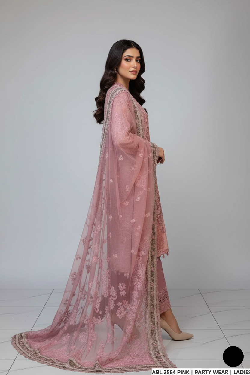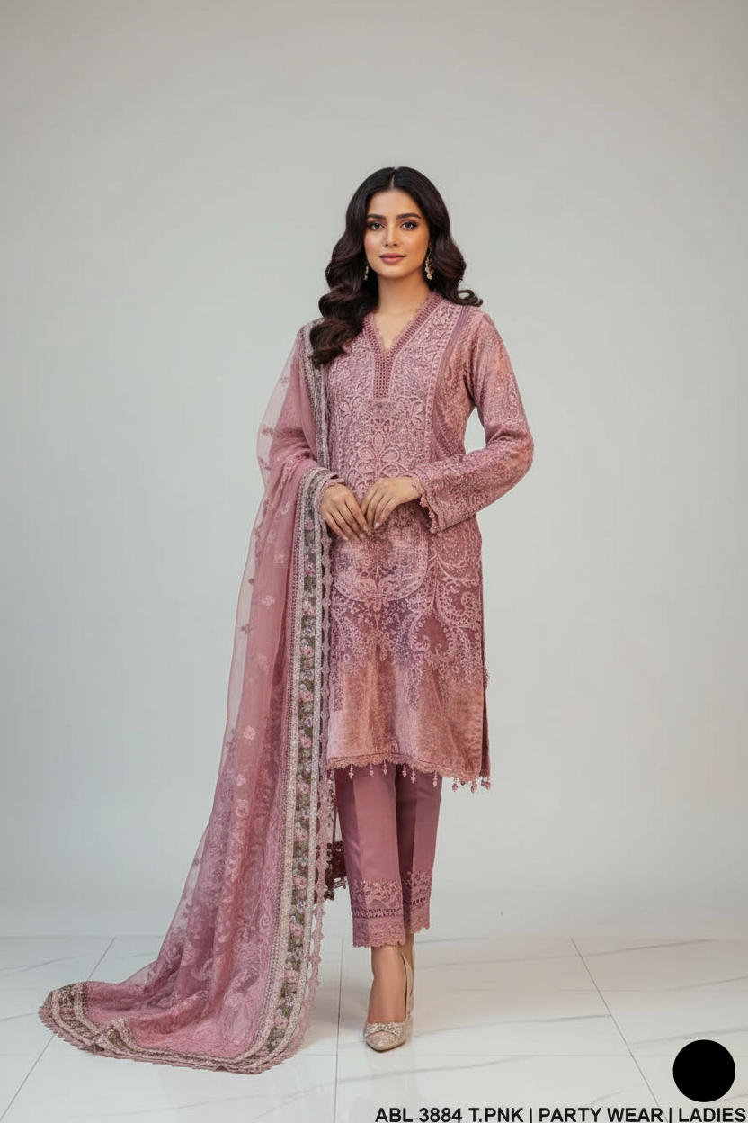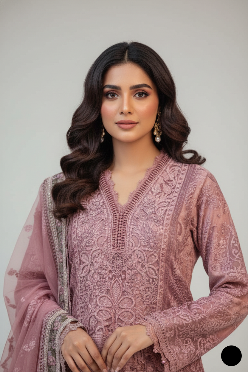 This elegant outfit features a straight shirt made from delicate organza, offering a graceful and airy appearance. It is paired with soft and breathable viscose trousers, ensuring all-day comfort. The look is beautifully completed with an organza dupatta that adds a refined and sophisticated touch. The shirt length ranges from 46 to 48 inches, making it a versatile piece for various occasions. With a total weight of just 1.450 kg, the ensemble strikes the perfect balance between lightweight comfort and stylish flair.