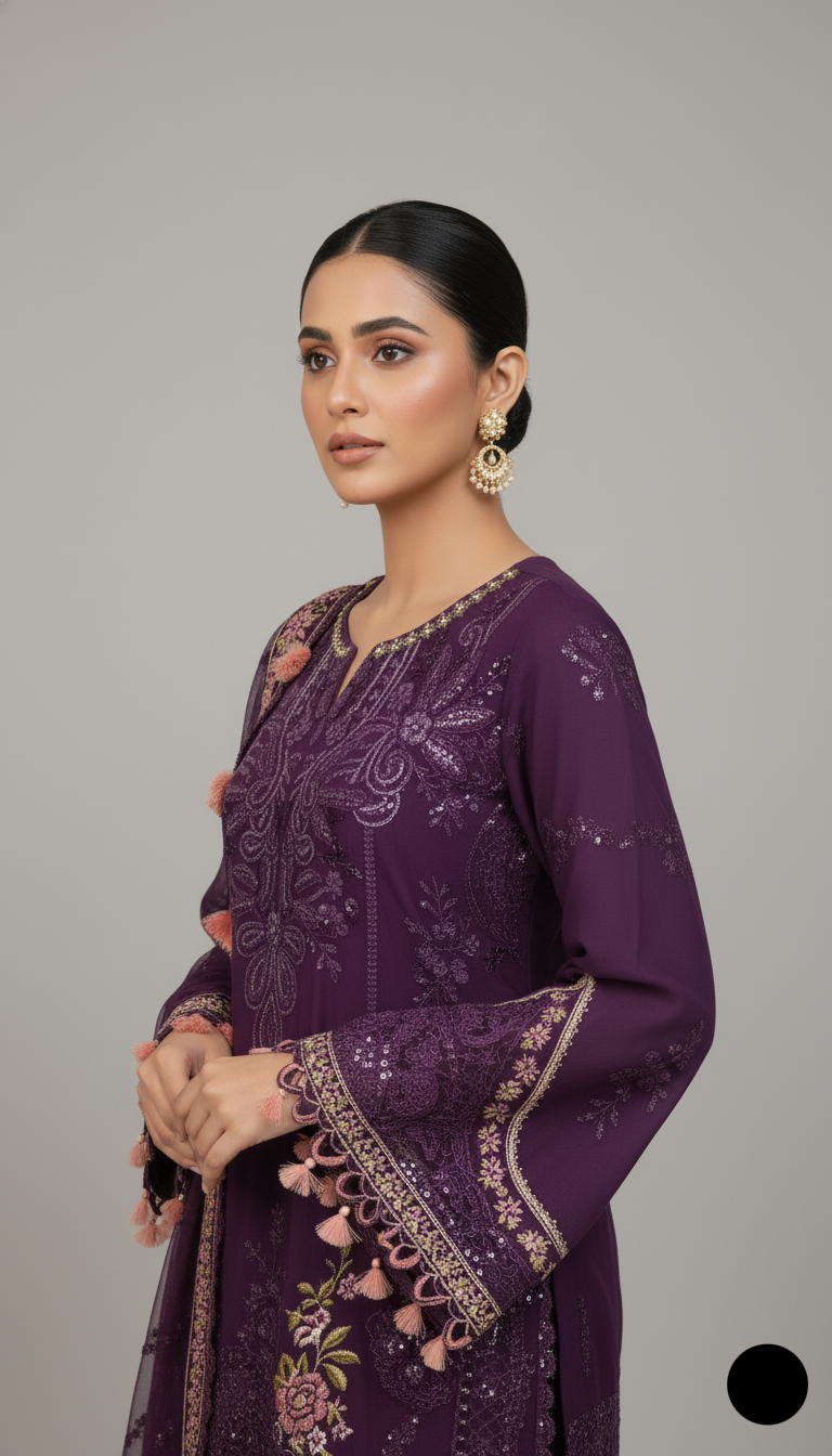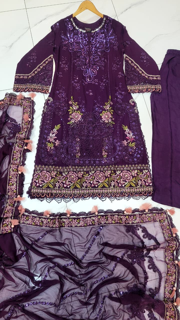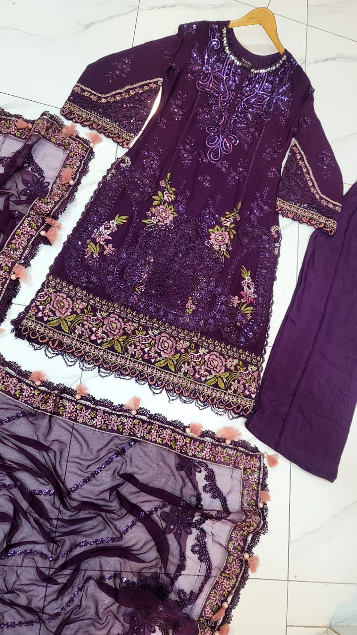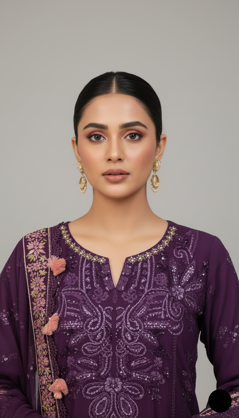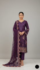 This sophisticated 3-piece outfit features a chiffon straight shirt with a flattering length of 46 to 48 inches, delivering an elegant and timeless look. It is paired with comfortable and sleek grip fabric trousers, and a matching chiffon dupatta that adds fluidity and grace to the ensemble. Weighing approximately 1.250 kg, this outfit offers a perfect blend of style, comfort, and quality—ideal for formal events, festive occasions, or traditional gatherings.