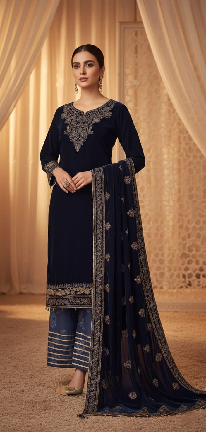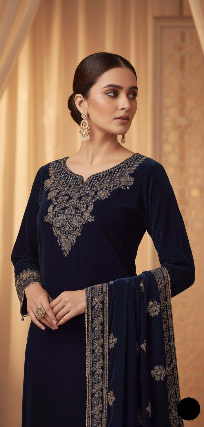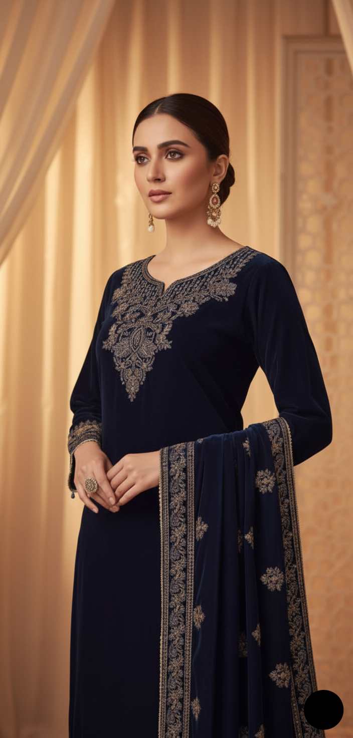 This stunning outfit is crafted from premium velvet fabric for the shirt, paired elegantly with grip trousers and a luxurious velvet shawl dupatta. Designed in a straight shirt with plazo style, it perfectly combines sophistication with comfort. The shirt length ranges from 43 to 45 inches, providing a flattering, graceful look, while the total outfit weight of 1.250 kg gives it a rich, high-quality feel. Ideal for winter festivities, weddings, or formal gatherings, this ensemble reflects timeless charm and elegance with every detail.