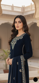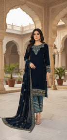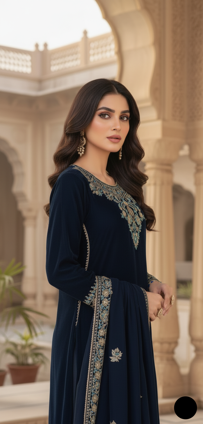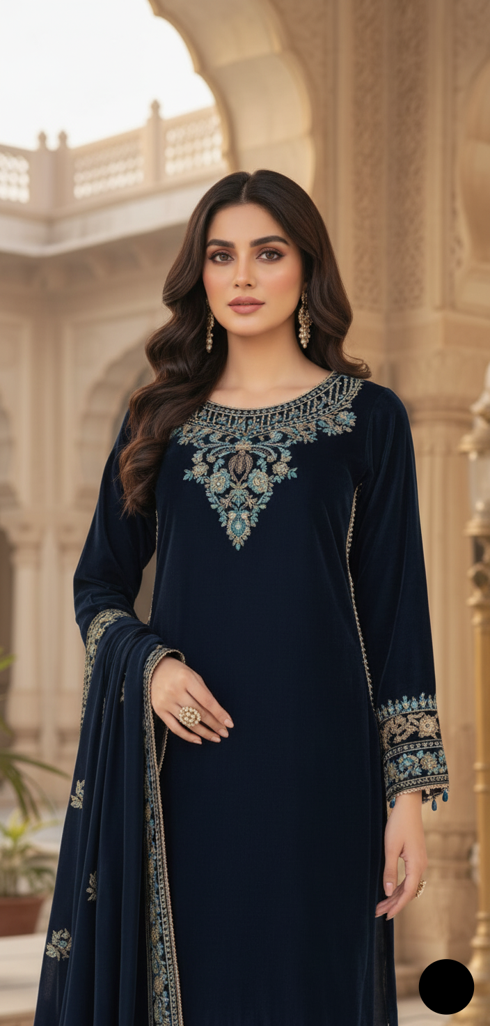 This stunning outfit is crafted from premium velvet fabric for the shirt, paired elegantly with grip trousers and a luxurious velvet shawl dupatta. Designed in a straight shirt with plazo style, it perfectly combines sophistication with comfort. The shirt length ranges from 43 to 45 inches, providing a flattering, graceful look, while the total outfit weight of 1.250 kg gives it a rich, high-quality feel. Ideal for winter festivities, weddings, or formal gatherings, this ensemble reflects timeless charm and elegance with every detail.