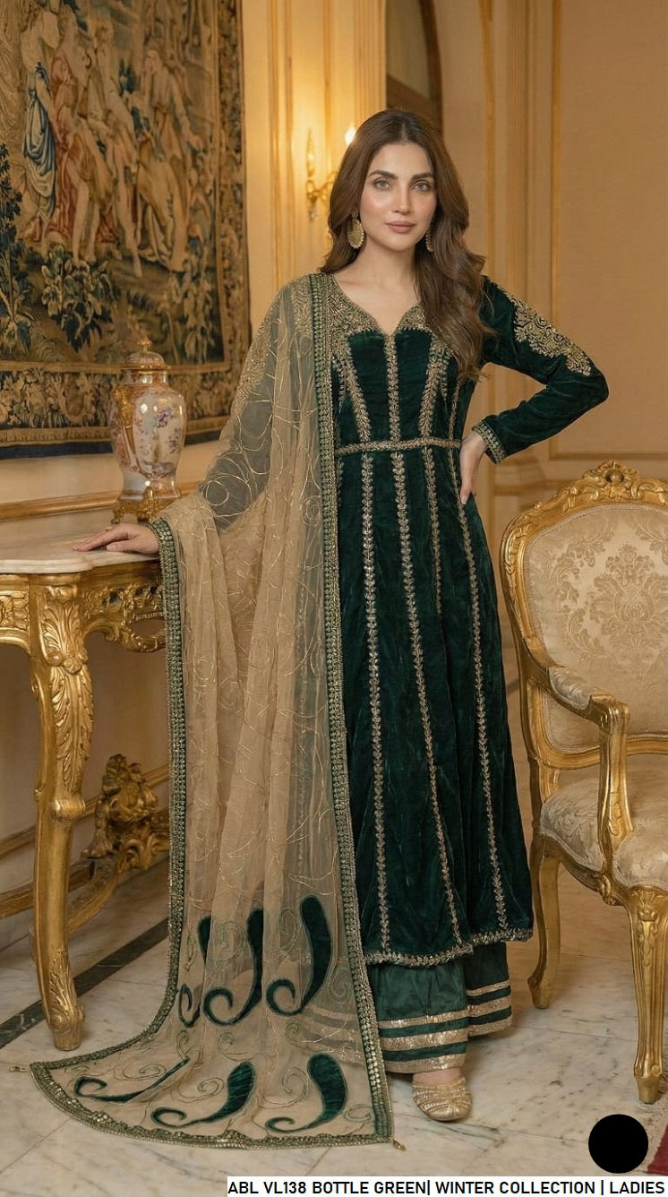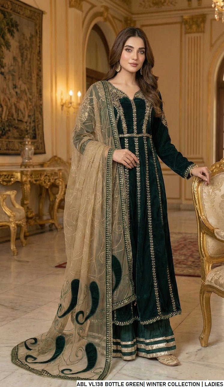 This elegant outfit features a luxurious velvet shirt paired with a beautifully flowing crush sharara, creating a refined traditional look. The ensemble is completed with a delicate organza dupatta that adds a soft and graceful touch. Designed in a long frock style, the shirt has a length of 50 to 52 inches, offering a regal silhouette. With a total weight of 1.150 kg, this outfit combines comfort with timeless style.