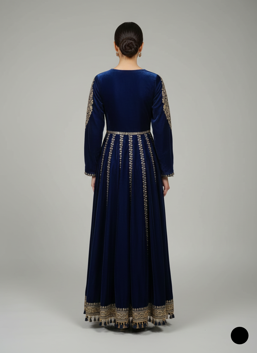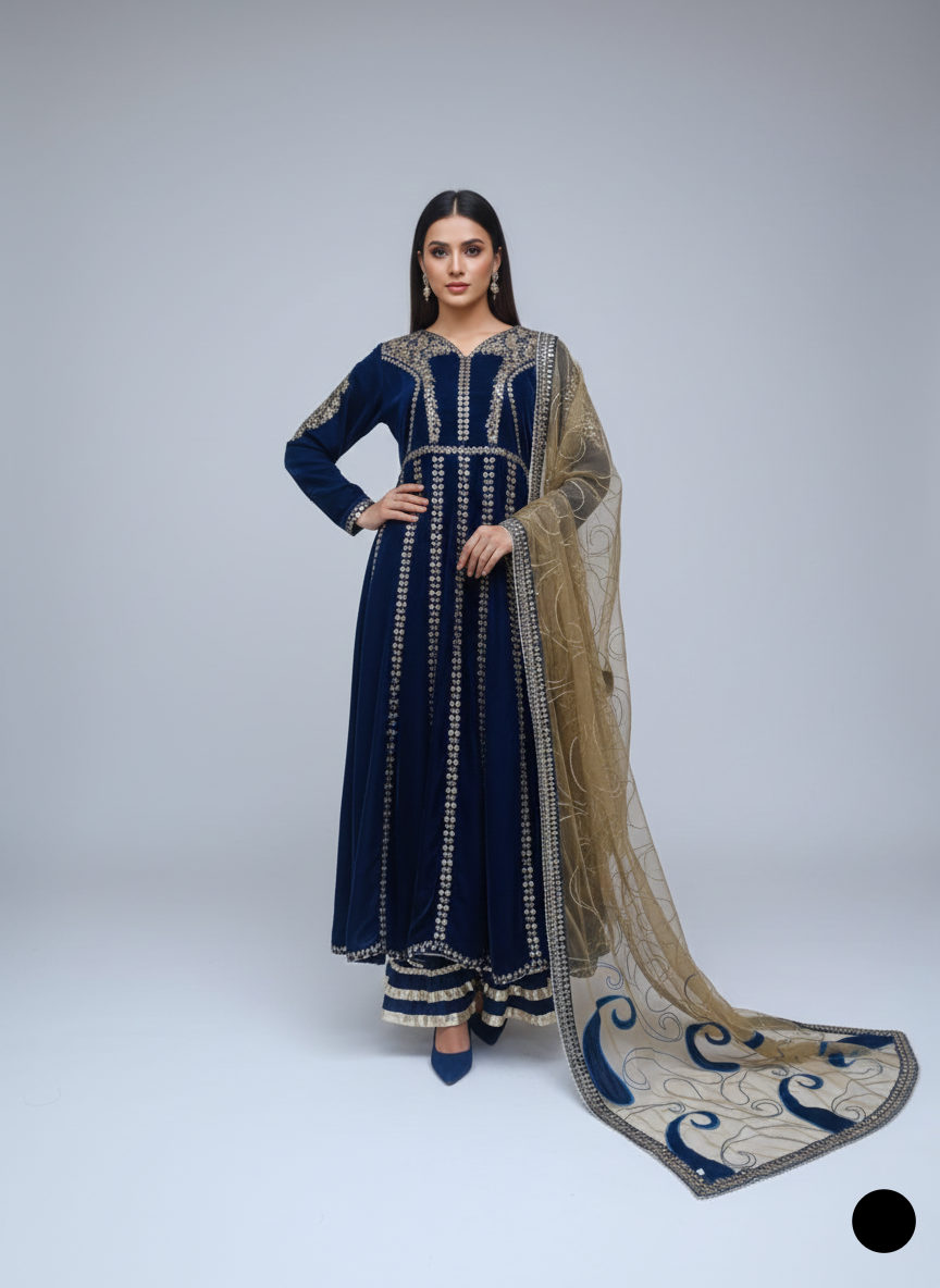 This elegant outfit features a luxurious velvet shirt paired with a beautifully flowing crush sharara, creating a refined traditional look. The ensemble is completed with a delicate organza dupatta that adds a soft and graceful touch. Designed in a long frock style, the shirt has a length of 50 to 52 inches, offering a regal silhouette. With a total weight of 1.150 kg, this outfit combines comfort with timeless style.
