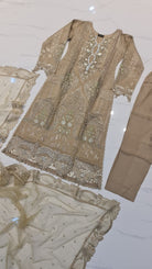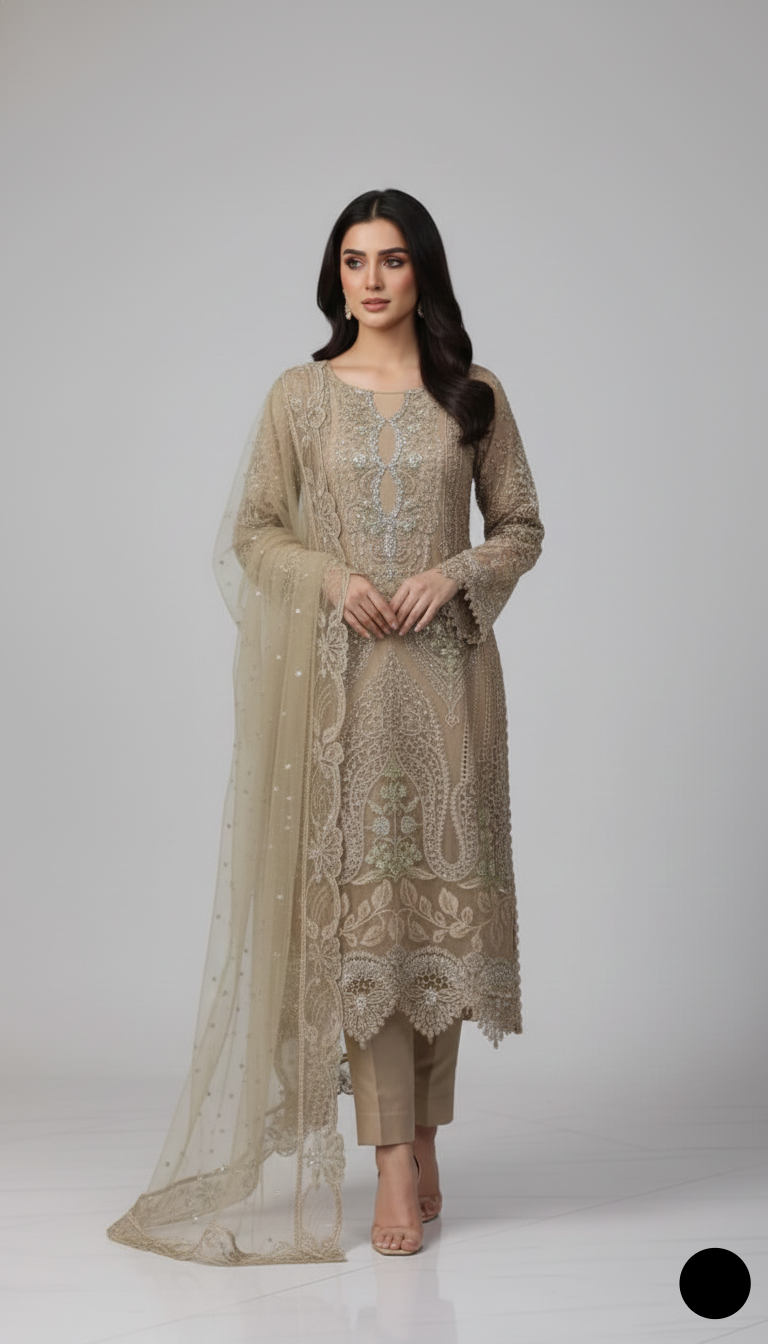 This outfit features a beautifully crafted organza shirt paired with comfortable grip trousers and a soft net dupatta. Designed in a classic straight shirt style, it offers an elegant and modern silhouette. The shirt comes in a versatile length of 47/49 inches, making it suitable for various preferences. With an overall weight of 0.850, the outfit is lightweight yet graceful, perfect for both formal and semi-formal wear.