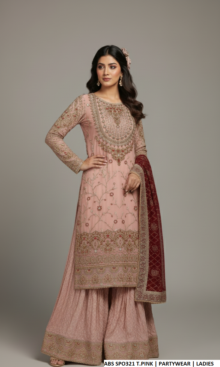 This elegant three-piece outfit features a chiffon straight shirt paired with stylish crushed palazzo trousers crafted from grip fabric, along with a matching chiffon dupatta. The combination offers a modern yet graceful look, making it an excellent choice for festive occasions, semi-formal events, and evening wear. With a shirt length of 41/43 inches and a premium weight of approximately 1.400 kg, this outfit provides both comfort and a luxurious drape.