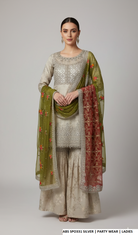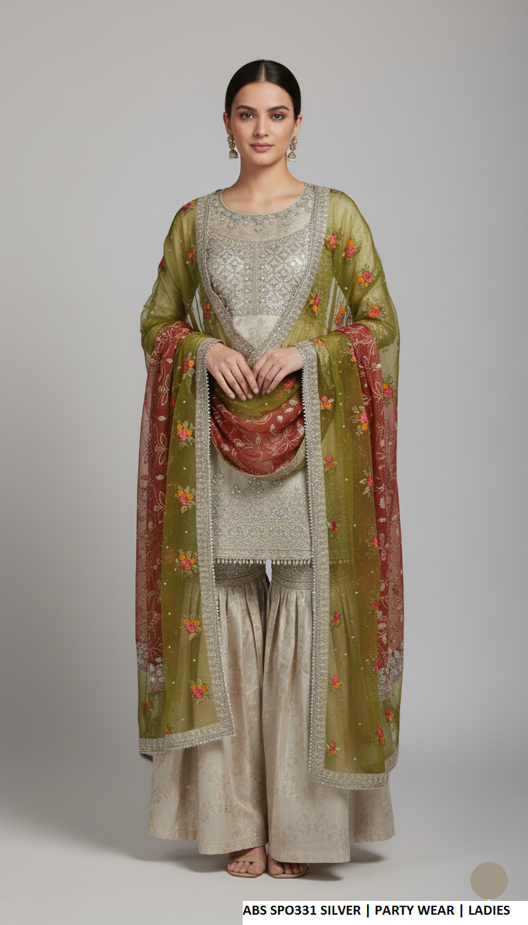 This luxurious outfit features a richly textured jamawar short shirt paired with matching jamawar garara and complemented by a delicate organza dupatta. Designed in a classic short shirt with garara style, it offers a traditional yet elegant look ideal for weddings, festive celebrations, and formal occasions. The shirt length of 34/36 inches creates a flattering silhouette, while the approximate weight of 1.400 kg highlights its premium craftsmanship and heavy festive appeal.