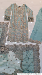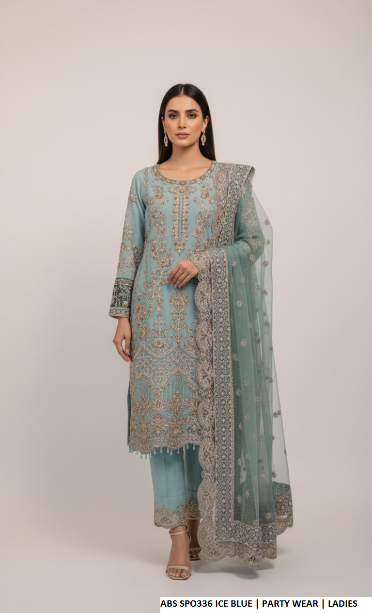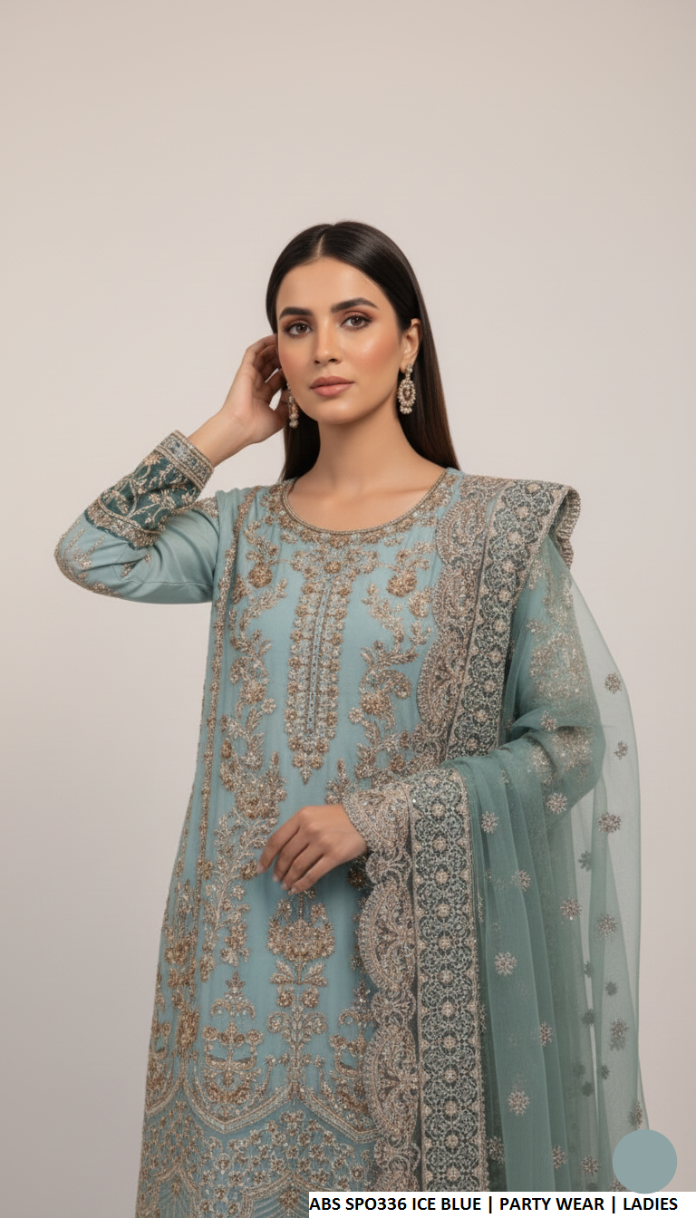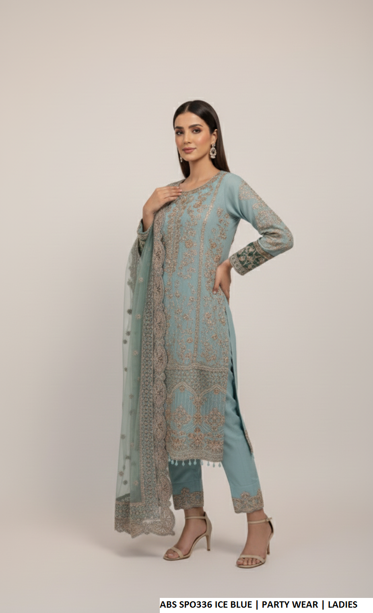 This elegant outfit features a chiffon shirt paired with a grip trouser and a lightweight organza dupatta. Designed in a classic straight shirt style, it offers a graceful and modern silhouette. The shirt length ranges between 40 to 42 inches, making it suitable for a refined and flattering look. With an overall weight of approximately 1.300 kg, the ensemble is comfortable to wear while maintaining a premium feel.