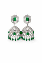 An elegant pair of silver-tone jhumkas adorned with radiant emerald-green stones and fine crystal detailing. Designed to catch light from every angle, these statement earrings bring a regal charm to festive, bridal, and formal looks. Lightweight yet striking, perfect for weddings, parties, and special occasions.