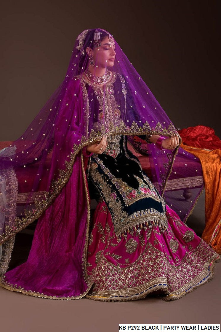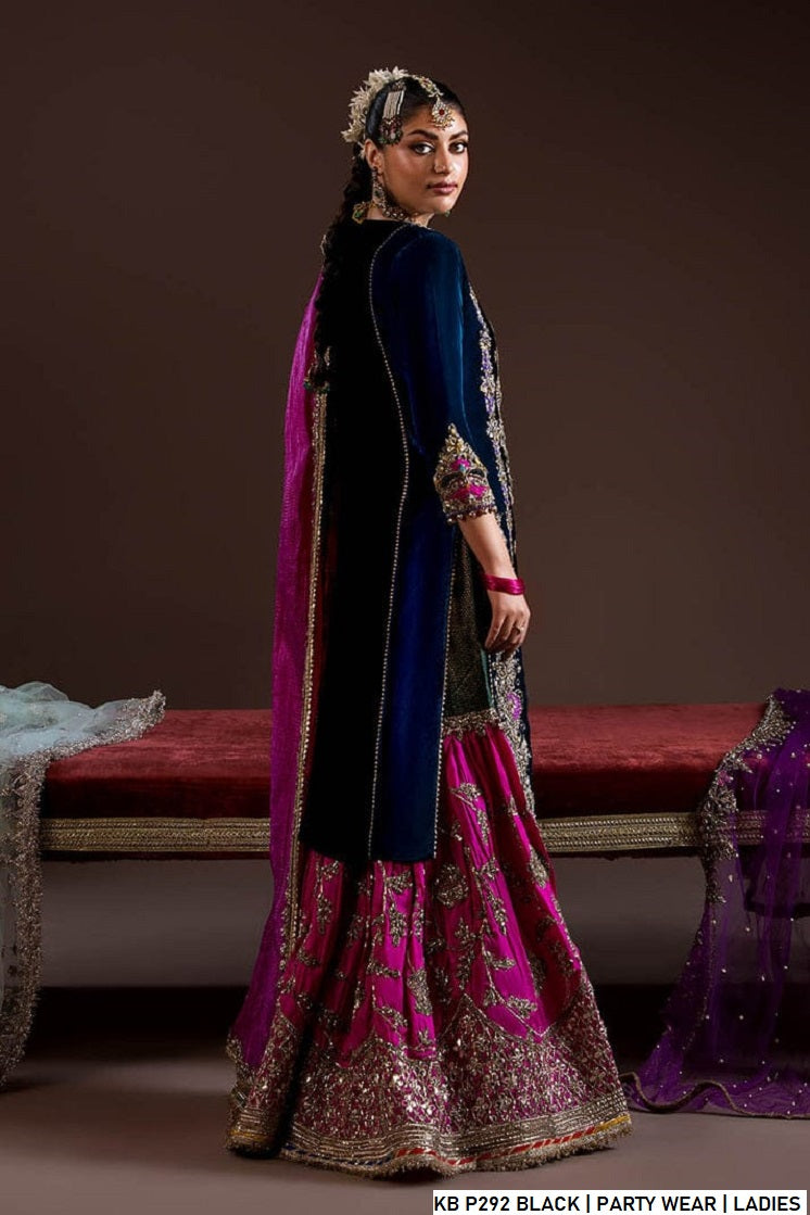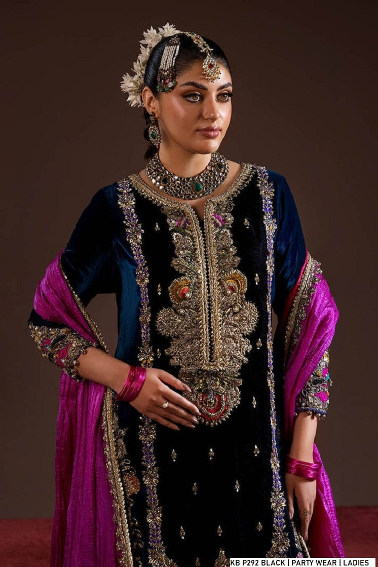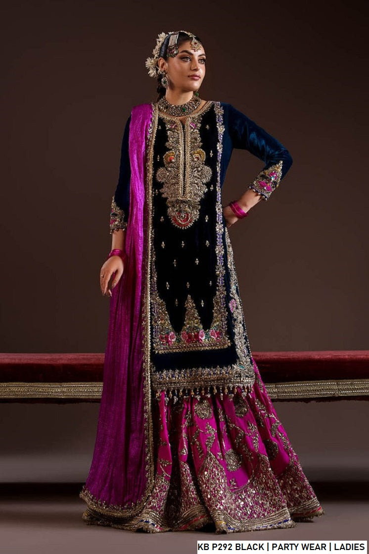 Shirt: Center panel Black color Velvet hand embroidered (Digital print applique, kora, dabka, zardozi & gotta work)