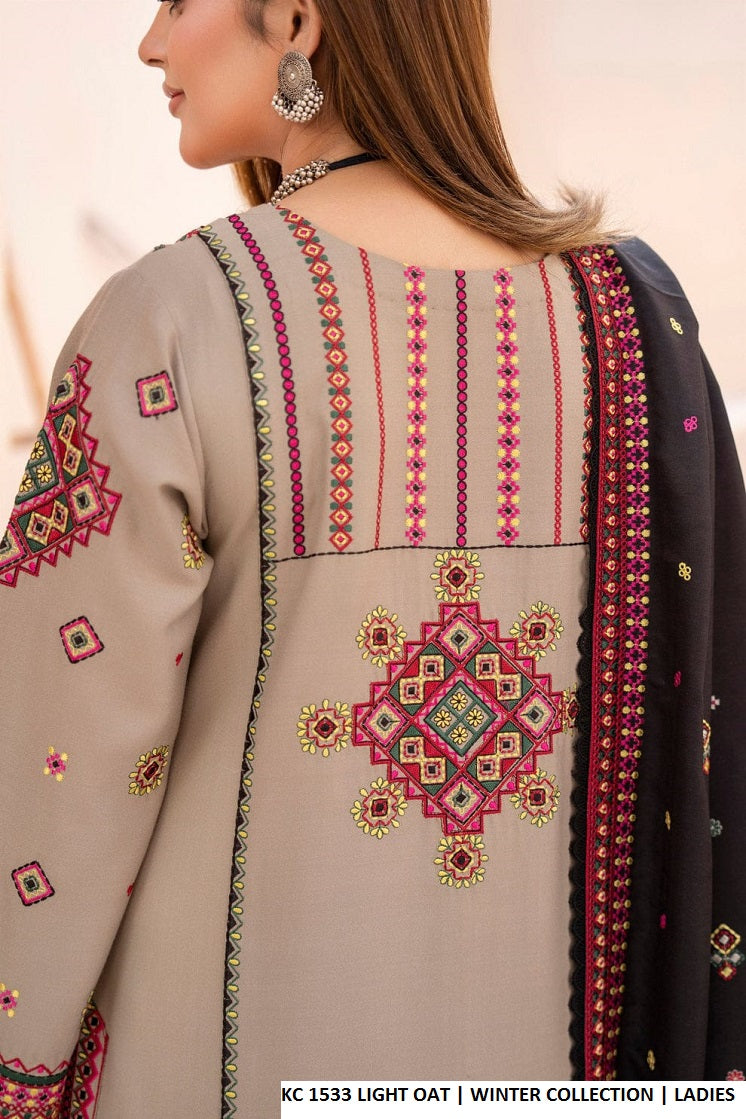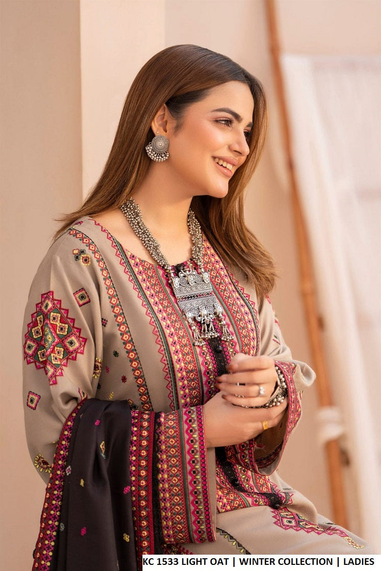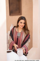 This stylish outfit is made from high-quality Dhanak fabric for both the shirt and trouser, providing warmth and comfort for the winter season. It is paired with an elegant embroidered shawl that adds a refined and graceful touch. Designed in a modern shirt with palazzo style, the outfit features a shirt length of 42/44 inches. With an approximate weight of 1.050 kg, it offers a perfect balance of style and wearability.