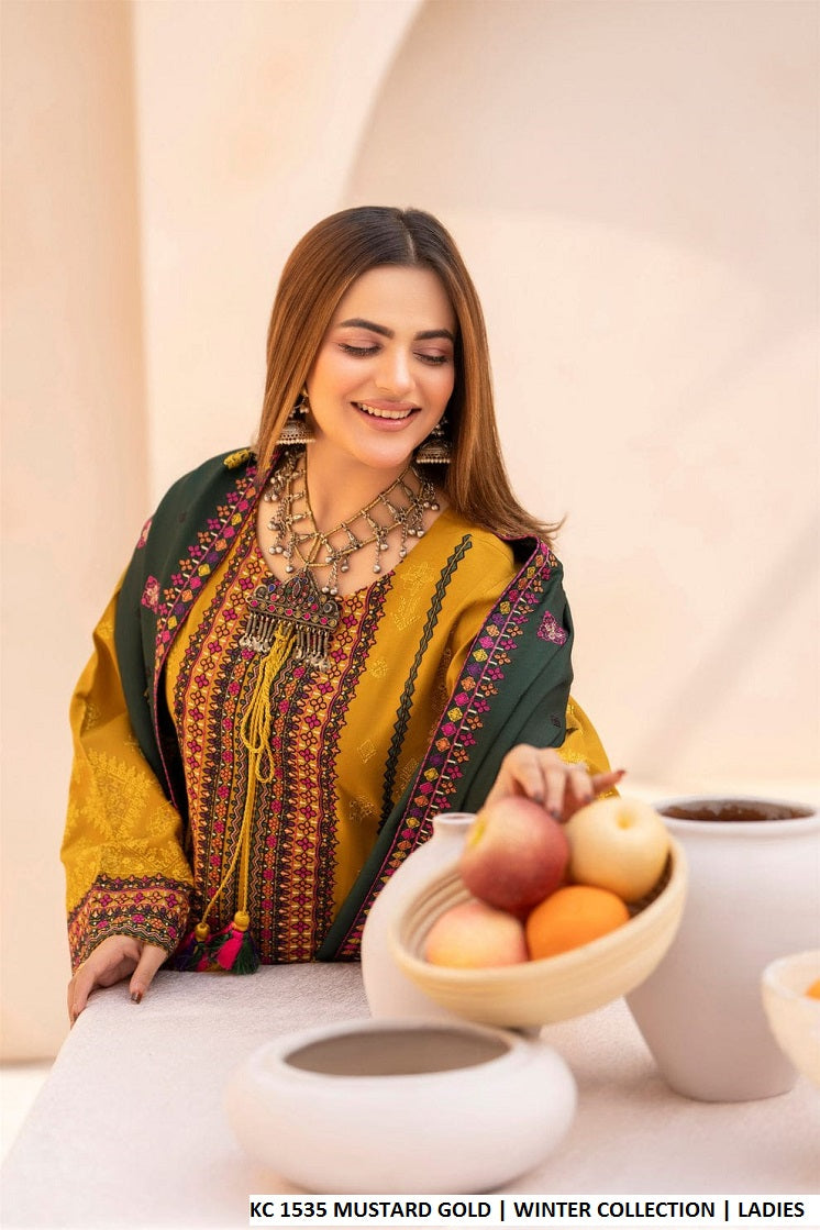 This elegant winter outfit is made from premium-quality Dhanak fabric for both the shirt and trouser, ensuring warmth and comfort throughout the season. It is paired with a beautifully embroidered shawl that adds a touch of sophistication and charm. Designed in a stylish shirt with palazzo style, the shirt features a graceful length of 44/46 inches. With an approximate weight of 1.100 kg, this outfit offers the perfect blend of style, comfort, and seasonal practicality.