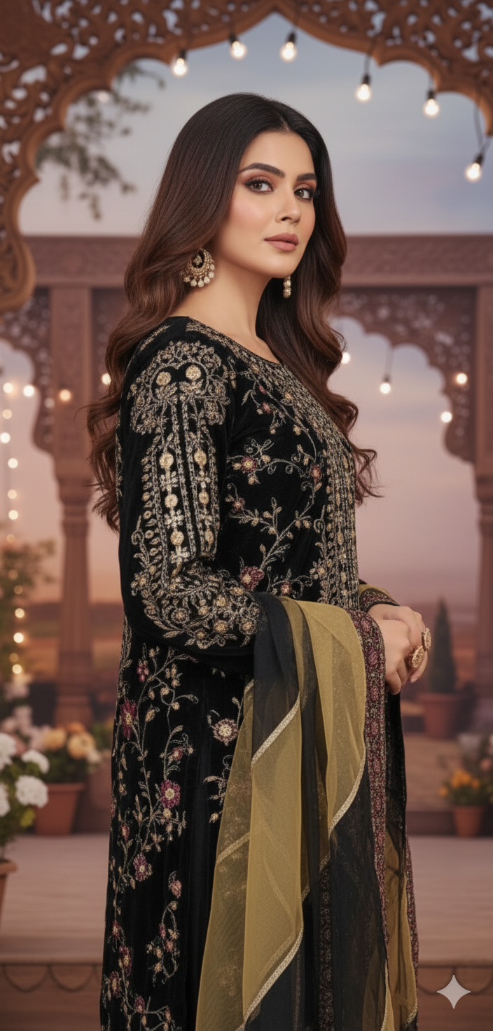 This elegant ensemble features a velvet shirt and trouser paired beautifully with a delicate organza dupatta. Designed in a straight shirt style with plazo, it offers a refined and luxurious look perfect for festive occasions or formal gatherings. The shirt length ranges between 42 to 44 inches, ensuring a graceful fit, while the total outfit weight is 1.250 kg, giving it a premium yet comfortable feel.
